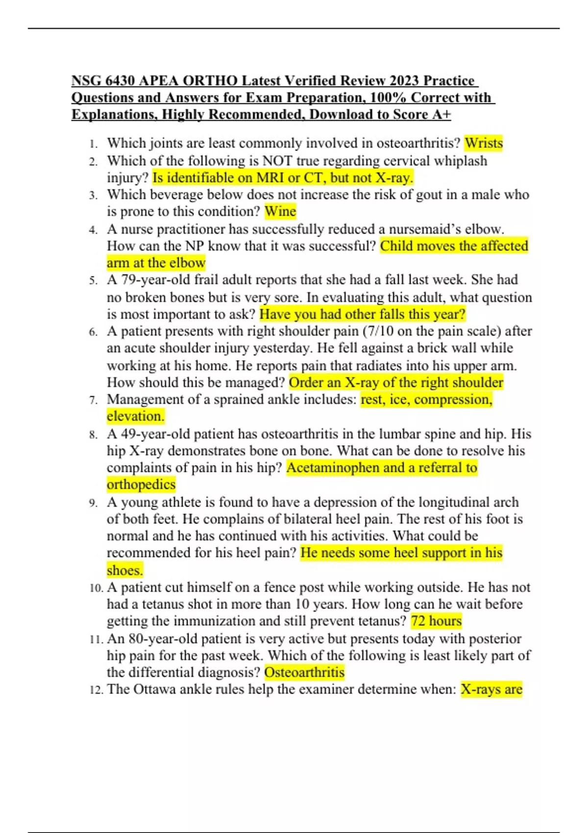 NSG 6430 APEA ORTHO Latest Verified Review 2023 Practice Questions and Answers for Exam Preparation, 100% Correct with Explanations, Highly Recommended, Download to Score A+ 1. Which joints are least commonly involved in osteoarthritis? Wrists 2. Which of the following is NOT true regarding cervical whiplash injury? Is identifiable on MRI or CT, but not X-ray. 3. Which beverage below does not increase the risk of gout in a male who is prone to this condition? Wine 4. A nurse practitioner has successfully reduced a nursemaid’s elbow. How can the NP know that it was successful? Child moves the affected arm at the elbow 5. A 79-year-old frail adult reports that she had a fall last week. She had no broken bones but is very sore. In evaluating this adult, what question is most important to ask? Have you had other falls this year? 6. A patient presents with right shoulder pain (7/10 on the pain scale) after an acute shoulder injury yesterday. He fell against a brick wall while working at his home. He reports pain that radiates into his upper arm. How should this be managed? Order an X-ray of the right shoulder 7. Management of a sprained ankle includes: rest, ice, compression, elevation. 8. A 49-year-old patient has osteoarthritis in the lumbar spine and hip. His hip X-ray demonstrates bone on bone. What can be done to resolve his complaints of pain in his hip? Acetaminophen and a referral to orthopedics 9. A young athlete is found to have a depression of the longitudinal arch of both feet. He complains of bilateral heel pain. The rest of his foot is normal and he has continued with his activities. What could be recommended for his heel pain? He needs some heel support in his shoes. 10. A patient cut himself on a fence post while working outside. He has not had a tetanus shot in more than 10 years. How long can he wait before getting the immunization and still prevent tetanus? 72 hours