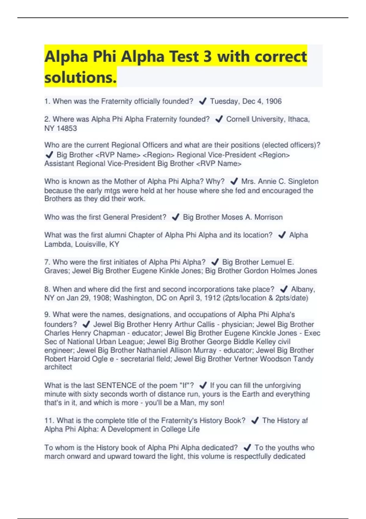 Alpha Phi Alpha Test 3 with correct solutions. 1. When was the Fraternity officially founded? ️ Tuesday, Dec 4, 1906 2. Where was Alpha Phi Alpha Fraternity founded? ️ Cornell University, Ithaca, NY 14853 Who are the current Regional Officers and what are their positions (elected officers)? ️ Big Brother <RVP Name> <Region> Regional Vice-President <Region> Assistant Regional Vice-President Big Brother <RVP Name> Who is known as the Mother of Alpha Phi Alpha? Why? ️ Mrs. Annie C. Singleton because the early mtgs were held at her house where she fed and encouraged the Brothers as they did their work. Who was the first General President? ️ Big Brother Moses A. Morrison What was the first alumni Chapter of Alpha Phi Alpha and its location? ️ Alpha Lambda, Louisville, KY 7. Who were the first initiates of Alpha Phi Alpha? ️ Big Brother Lemuel E. Graves; Jewel Big Brother Eugene Kinkle Jones; Big Brother Gordon Holmes Jones 8. When and where did the first and second incorporations take place? ️ Albany, NY on Jan 29, 1908; Washington, DC on April 3, 1912 (2pts/location & 2pts/date) 9. What were the names, designations, and occupations of Alpha Phi Alpha's founders? ️ Jewel Big Brother Henry Arthur Callis - physician; Jewel Big Brother Charles Henry Chapman - educator; Jewel Big Brother Eugene Kinckle Jones - Exec Sec of National Urban League; Jewel Big Brother George Biddle Kelley civil engineer; Jewel Big Brother Nathaniel Allison Murray - educator; Jewel Big Brother Robert Haroid Ogle e - secretarial fleld; Jewel Big Brother Vertner Woodson Tandy architect What is the last SENTENCE of the poem "If"? ️ If you can fill the unforgiving minute with sixty seconds worth of distance run, yours is the Earth and everything that's in it, and which is more - you'll be a Man, my son! 11. What is the complete title of the Fraternity's History Book? ️ The History af Alpha Phi Alpha: A Development in College Life To whom is the History book of Alpha Phi Alpha dedicated? ️ To the youths who march onward and upward toward the light, this volume is respectfully dedicated