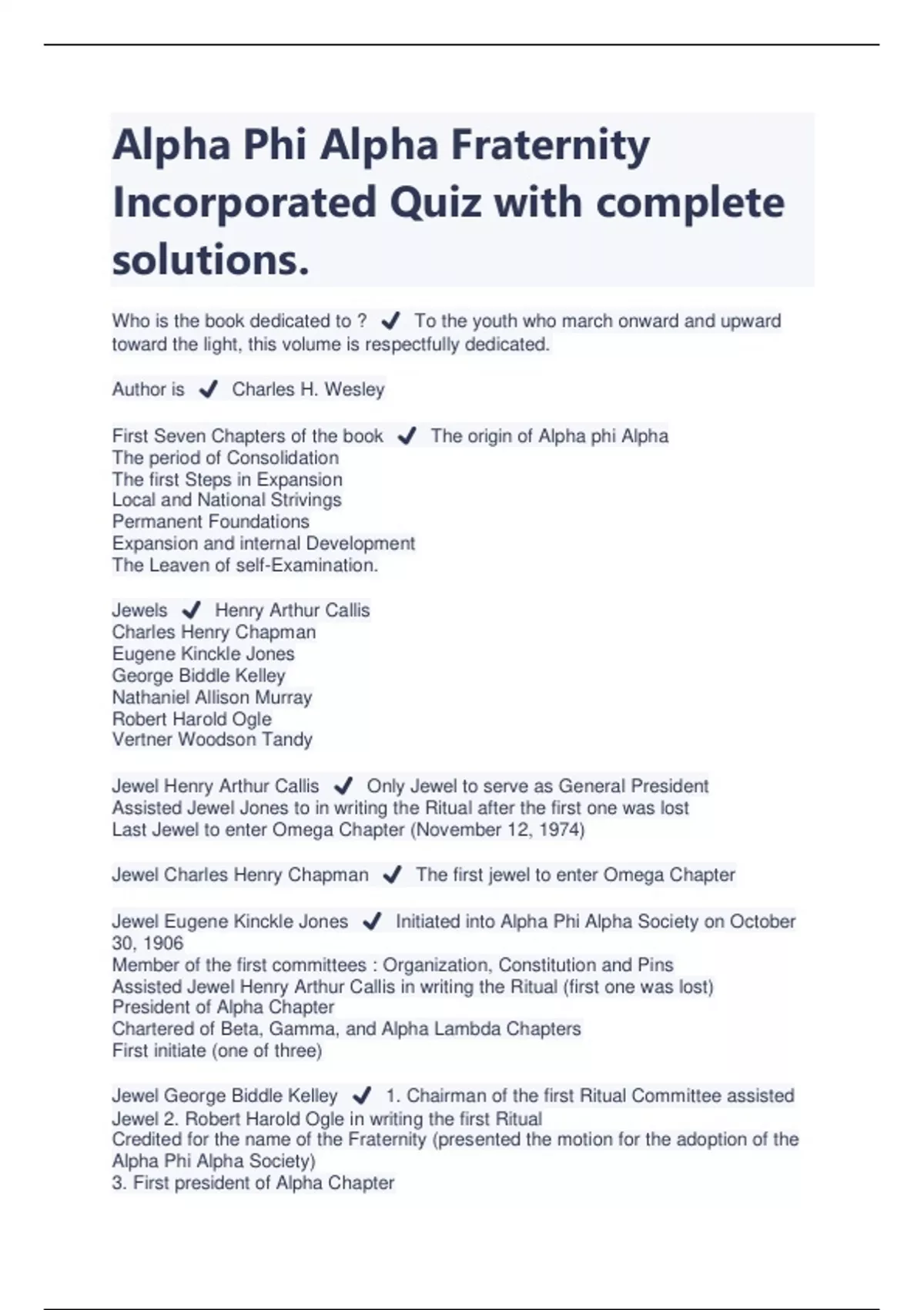 Alpha Phi Alpha Fraternity Incorporated Quiz with complete solutions. Who is the book dedicated to ? ️ To the youth who march onward and upward toward the light, this volume is respectfully dedicated. Author is ️ Charles H. Wesley First Seven Chapters of the book ️ The origin of Alpha phi Alpha The period of Consolidation The first Steps in Expansion Local and National Strivings Permanent Foundations Expansion and internal Development The Leaven of self-Examination. Jewels ️ Henry Arthur Callis Charles Henry Chapman Eugene Kinckle Jones George Biddle Kelley Nathaniel Allison Murray Robert Harold Ogle Vertner Woodson Tandy Jewel Henry Arthur Callis ️ Only Jewel to serve as General President Assisted Jewel Jones to in writing the Ritual after the first one was lost Last Jewel to enter Omega Chapter (November 12, 1974) Jewel Charles Henry Chapman ️ The first jewel to enter Omega Chapter Jewel Eugene Kinckle Jones ️ Initiated into Alpha Phi Alpha Society on October 30, 1906 Member of the first committees : Organization, Constitution and Pins Assisted Jewel Henry Arthur Callis in writing the Ritual (first one was lost) President of Alpha Chapter Chartered of Beta, Gamma, and Alpha Lambda Chapters First initiate (one of three) Jewel George Biddle Kelley ️ 1. Chairman of the first Ritual Committee assisted Jewel 2. Robert Harold Ogle in writing the first Ritual Credited for the name of the Fraternity (presented the motion for the adoption of the Alpha Phi Alpha Society) 3. First president of Alpha Chapter
