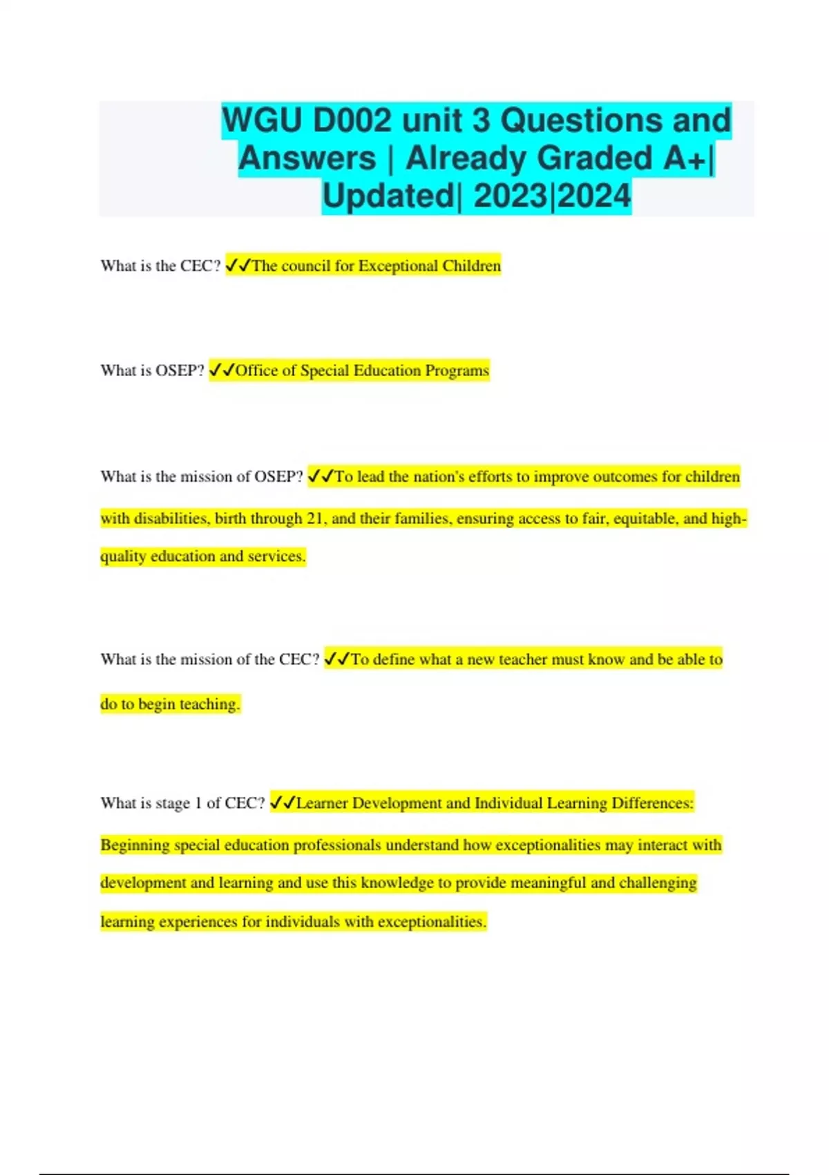 WGU D002 unit 3 Questions and Answers | Already Graded A+| Updated| 2023|2024 What is the CEC? The council for Exceptional Children What is OSEP? Office of Special Education Programs What is the mission of OSEP? To lead the nation's efforts to improve outcomes for children with disabilities, birth through 21, and their families, ensuring access to fair, equitable, and high- quality education and services. What is the mission of the CEC? To define what a new teacher must know and be able to do to begin teaching. What is stage 1 of CEC? Learner Development and Individual Learning Differences: Beginning special education professionals understand how exceptionalities may interact with development and learning and use this knowledge to provide meaningful and challenging learning experiences for individuals with exceptionalities. What is stage two of cec? Learning Environments: Beginning special education professionals create safe, inclusive, culturally responsive learning environments so that individuals with exceptionalities become active and effective learners and develop emotional well being, positive social interactions, and self-determination. What is stage three of cec? Curricular Content Knowledge: Beginning special education professionals use knowledge of general and specialized curricula to individualize learning for individuals with exceptionalities. What is stage four of cec? Assessment: Beginning special education professionals use multiple methods of assessment and data sources in making educational decisions. What is stage five of cec? Instructional Planning and Strategies: Beginning special education professionals select, adapt, and use a repertoire of evidence-based instructional strategies to advance learning of individuals with exceptionalities. What is stage six of cec? Professional Learning and Ethical Practice: Beginning special education professionals use foundational knowledge of the field and their professional ethical principles and practice standards to inform special education practice, to engage in lifelong learning, and to advance the profes
