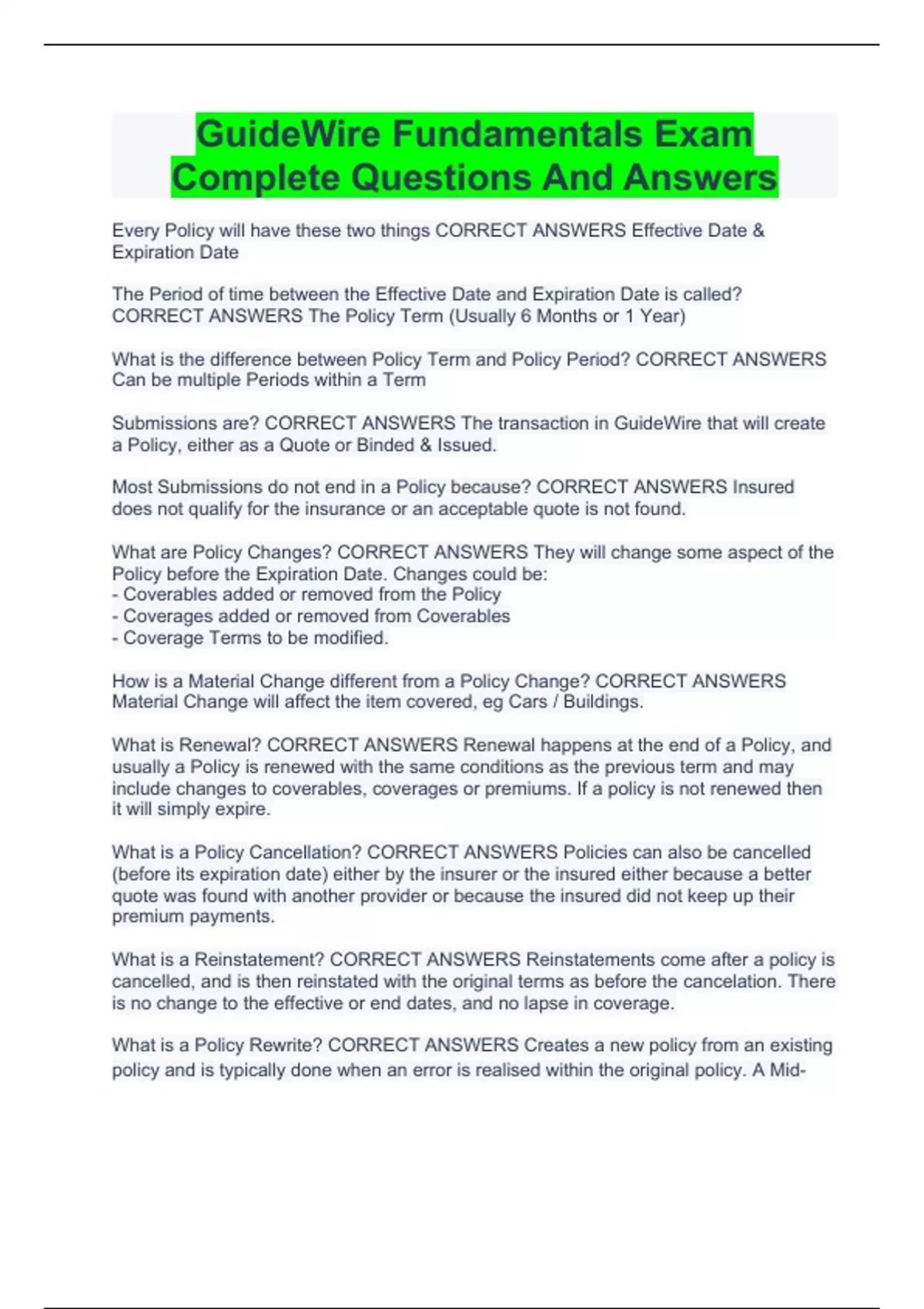 GuideWire Fundamentals Exam Complete Questions And Answers