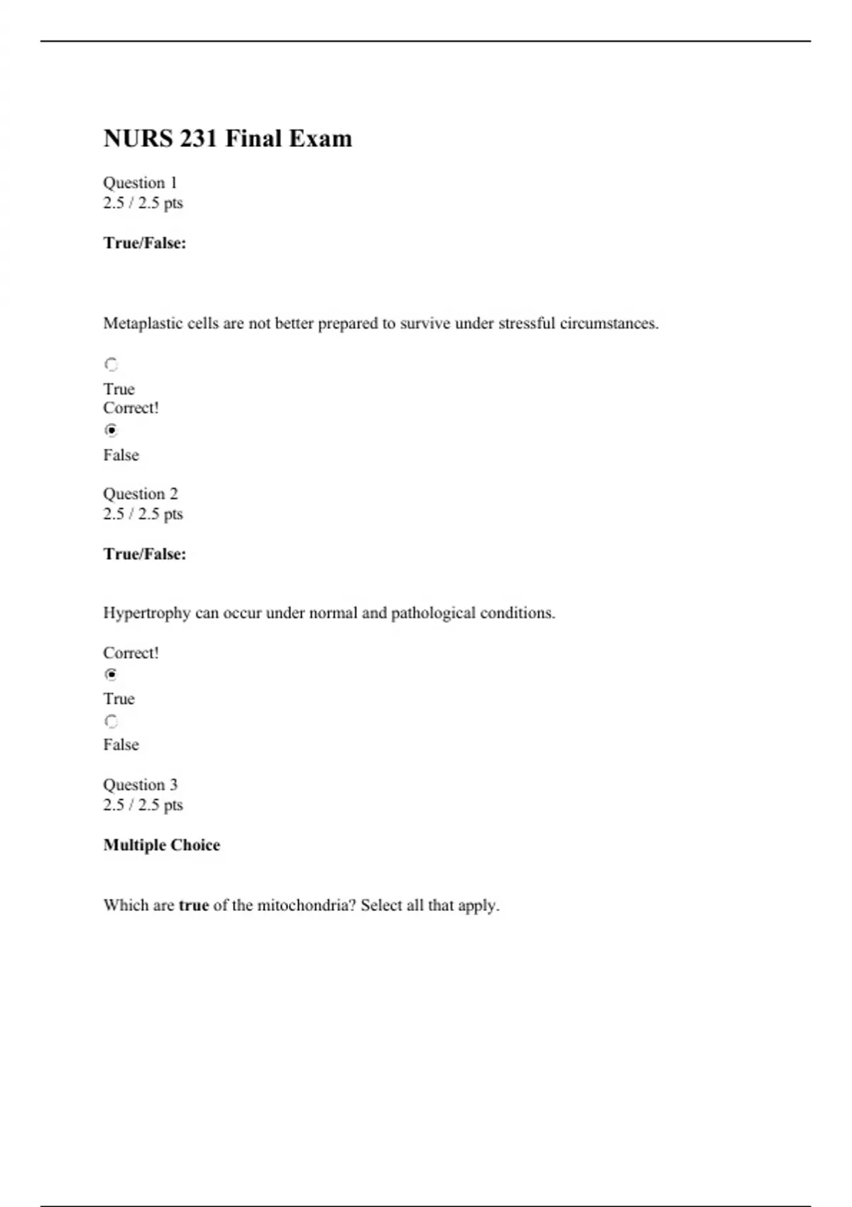 NURS 231 Final Exam Question 1 2.5 / 2.5 pts True/False: Metaplastic cells are not better prepared to survive under stressful circumstances. True Correct! False Question 2 2.5 / 2.5 pts True/False: Hypertrophy can occur under normal and pathological conditions. Correct! True False Question 3 2.5 / 2.5 pts Multiple Choice Which are true of the mitochondria? Select all that apply. Correct! It is involved in cellular respiration They are found far from the site of energy consumption Correct! They play a role in apoptosis They control free radicals Question 4 2.5 / 2.5 pts Which are true of the cell membrane? Select all that apply. Correct! Controls the transport of materials from the outside fluids to within The main structural component is made of proteins Correct! Helps with the conduction of electrical currents in nerve and muscle cells Correct! Aids in the regulation of cell growth and proliferation Question 5 10 / 10 pts Compare and contrast the two types of gangrenous necrosis. Your Answer: Dry gangrene occurs when blood supply is slowly reduced to an area. The area is dehydrated and becomes dark or black in color. Commonly seen in patients with diabetes. It is not very painful, but tissues eventually die. Wet gangrene is casued with a sudden reduction in blood flow. The area is cold and swollen, with no pulse. This can occur from trauma. Bacteria is involved and is very painful. It has the appearance of pus, becasue it looks wet. There is also a foul smell. In dry gangrene the affected tissue becomes dry and shrinks, the skin wrinkles, and its color changes to dark brown or black. The spread of dry gangrene is slow. It results from a cut off in arterial blood supply and is a form of coagulation necrosis. In wet gangrene, the affected area is cold, swollen, and pulseless. The skin is moist, black, and under tension. Blebs form on the surface, liquefaction occurs, and a foul odor is caused by bacterial action. The spread of tissue damage is rapid. Question 6 2.5 / 2.5 pts True/False: Cell proliferation is the process in which proliferating cells become more specialized cell types. True Correct! False False, cell differentiation Question 7 2.5 / 2.5 pts True/False: Cell differentiation is the process of increasing cell numbers by mitotic cell division. True Correct! False False, cell proliferation Question 8 2.5 / 2.5 pts What are two important properties that stem cells possess? Your Answer: Stem cells possess potency and self-renewal. Potency and self-renewal Question 9 2.5 / 2.5 pts These are cells of the same lineage that have not yet differentiated to the extent that they have lost their ability to divide: Your Answer: progenitor or parent cells progenitor or parent cells Question 10 10 / 10 pts 1. is a systemic treatment that enables drugs to reach the site of the tumor as well as other distant sites. 2. The profound weight loss and wasting of fat and tissue that accompany cancer is known as . Your Answer: 1. chemotherapy 2. cancer anorexia-cachexia syndrome 1. chemotherapy 2. cancer anorexia-cachexia syndrome Question 11 5 / 5 pts Short answer Explain the challenges of diagnosing autoimmune disorders. Your Answer: There are about 80 autoimmune disorders identified, with many overlapping presentations. Blood tests can be more generic and results are imprecise. Markers can be elevated in the presecence of other diseases. There are over 80 identified, many with overlapping presentations. Many manifestations are nonspecific and are seen in other non-autoimmune diseases. Blood testing isn’t perfect either, as some tests are more generic and can be elevated in the presence of other diseases. Question 12 2.5 / 2.5 pts True/False: The T cells that display the host’s MHC antigens and T-cell receptors for a nonself-antigen are allowed to mature, a process termed negative selection. True Correct! False Question 13 2.5 / 2.5 pts Multiple Choice: Which lab value will typically be increased in a viral infection? Neutrophils Eosinophils Basophils Correct! Lymphocytes Question 14 10 / 10 pts A 9-year-old boy with a peanut allergy was exposed to peanuts. He presents to the emergency room with an anaphylactic reaction. (1) What symptoms might he present with? (2) Does the quantity of exposure mean he will have a more severe reaction? (3) What is the initial immediate treatment? (4) What are 2 things people with anaphylaxis should always carry? Your Answer: 1) Shortness of breath, skin redness/hives, GI discomfort such as cramping, nausau. 2) Does NOT play a role 3) epinephrine 4) idenitification of the allergy and EpiPen (1) Any of the following reactions are accepted. Grade I: erythema and urticaria, with or without angioedema. Grade II: hypotension, tachycardia, dyspnea, and GI manifestations, like nausea, vomiting, diarrhea, and abdominal cramping from mucosal edema. Grade III: bronchospasm, cardiac dysrhythmias, and cardiac collapse. Grade IV: cardiac arrest (2) No (3) Epinephrine (4) identification about allergy, EpiPen Question 15 0 / 2.5 pts Multiple Choice: A 23-year-old African-American man with a history of severe lifelong anemia requiring many transfusions has nonhealing leg ulcers and recurrent periods of abdominal and chest pain. These signs and symptoms are most likely to be associated with which one of the following laboratory abnormalities? Correct Answer