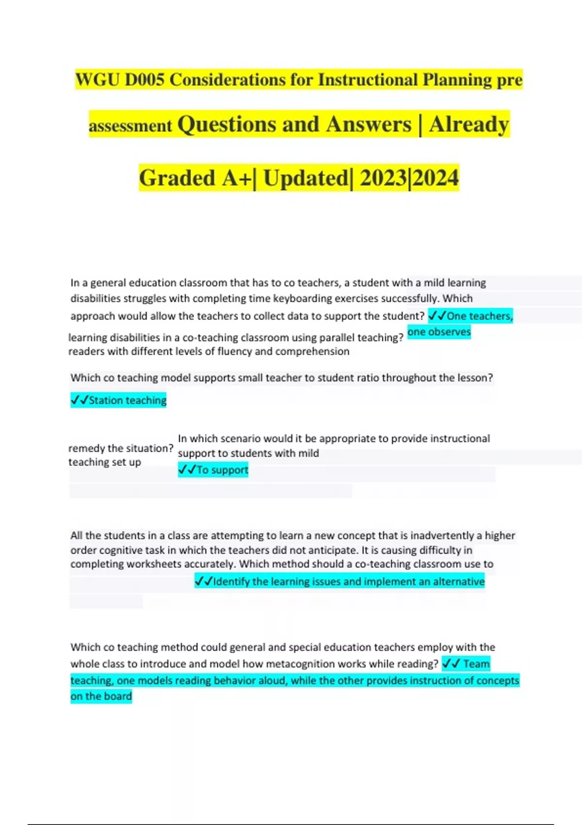 WGU D005 Considerations for Instructional Planning pre assessment Questions and Answers | Already Graded A+| Updated| 2023|2024