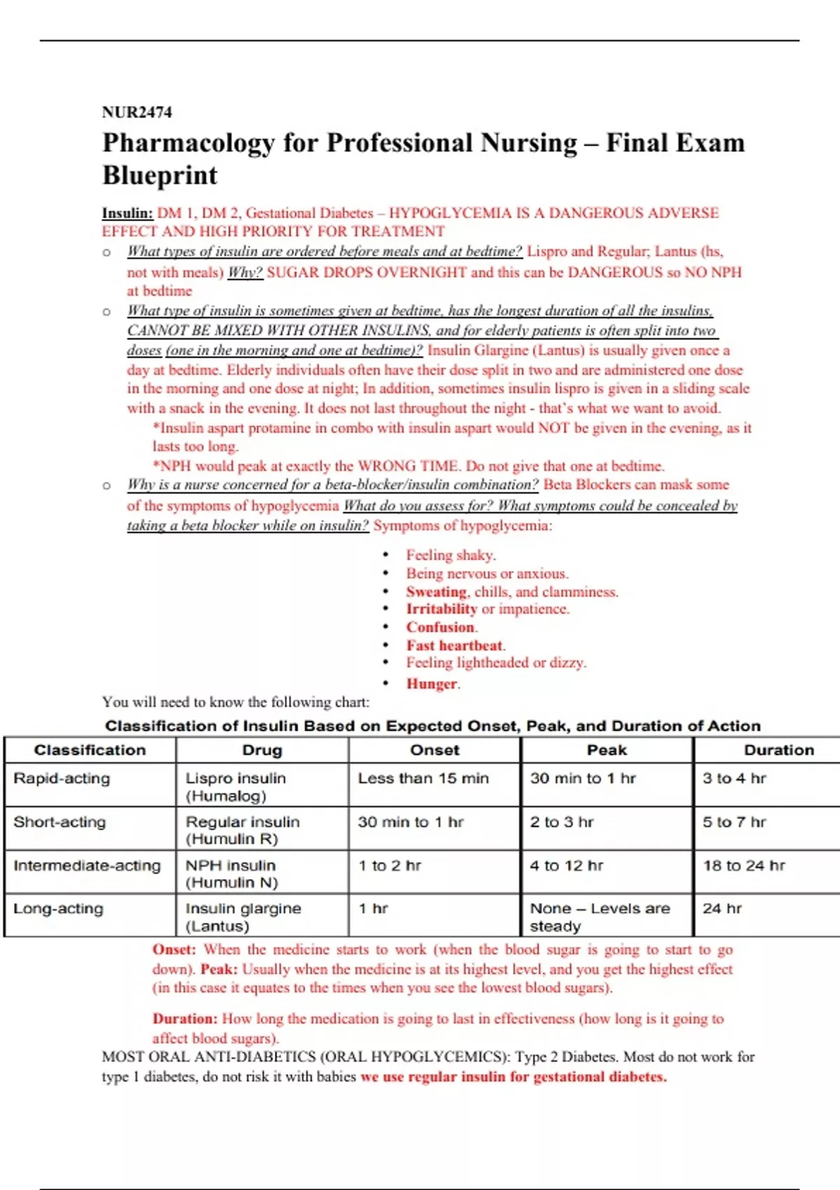 NUR 2474 Final Exam Blueprint Prescribing Basics: 2 questions Prescriptive authority regulated by the state BON in each state. Tall man lettering to highlight dissimilaries with look-alike names *Prescription contains… Physicians Name, Address, and telephone number are required to be included in the prescription. DEA number (two letters, five numbers) if the prescription is for controlled substance, Patient name and DOB (also may include address and weight), Date Rx is written (expires 1 year after date issued), Name of drug and strength- avoid trailing zeroes, use leading zeroes, Directions with indications/route of administration and frequency, write out number of refills, quantity of drug, signature, NPI number (9 or 11 numbers), sign as A-PNP or role recognized by the BON Drug schedules – one is most addictive, up to schedule 5. 1) heroin, LSD, marijuana. 2) oxycodone, hydrocodone, methamphetamines. 3) codeine, ketamine, testosterone. 4) Xanax, valium, ambien, tramadol. 5) antidiarrheal, antitussives, Lomotil, lyrica. *calculation question Pharmacology Principles: 3 questions Pharmacodynamics – effect of drugs on body. Works by receptors. Usually proteins that interact with drugs. Agonist – produce receptor stimulation, conformational change every time they bind. Partial agonist – properties between agonists and antagonists. Submaximal effect. Stimulate only some of the receptors. Antagonist – affinity for receptor but NO intrinsic activity. Affinity allows antagonist to bind to receptors, but lack of intrinsic activity prevents receptor activation. Blocks action of drugs (example Narcan). Therapeutic range – between minimum effective concentration and toxic concentration. Working effectivity with no toxicity or adverse effects. Wider therapeutic range is better! Easiest to control. Bioavailability – percentage of dose of drug that survives first pass through liver and reaches blood stream. Half life – time required for amount of drug to decline by 50%. Shorter half life admin more frequently. 4.5-5 half lives to get to steady state and to eliminate from body. Pharmacokinetics – what body does to drug. Absorption, distribution, metabolism, elimination. (ADME) Parenteral (bypass first pass), then oral, then lungs, then skin, eye and ears for best absorption. Distribution affected by lipid/water solubility, PH, protein binding, size of molecule. Protein binding – unbound drug is free drug which is active. When 2 highly bound drugs are given it increases the level of one of the drugs, leading to toxicity. IE warfarin and phenytoin are both highly protein bound. Low plasma protein result in more free drug. May be in elderly, so decrease dose of medication. T3 and T4 both highly protein bound. 1% of drug is powerful. Distribution – BBB (only lipid soluble will pass) – these such as narcotics, only work because they do cross BBB. Some meds we do not want to pass. Placental barrier (many drugs can pass) so be careful with drugs in pregnancy. Metabolism – liver. Chemical change of a drug structure to enhance excretion, inactivate drug, increase therapeutic action, activate prodrug, increase or decrease toxicity. Substrate – agent that is metabolized by an enzyme into a metabolite and product and eventually excreted. *Inhibitors – compete with other drugs for a particular enzyme affecting the metabolism (decreases) of the substrate and decreases the excretion of the substrate and increasing the circulating drug. Need to decrease dose of substrate if start on an inhibitor. INH increases substrate. *Inducer – competes with other drugs for a particular enzyme affecting metabolism of the substrate (increases) decreasing the efficacy of the drug. Need to increase dose of substrate if start on an inducer. IND decreases substrate. Renal excretion – passive glomerular filtration, active tubular secretion, tubular reabsorption. Pharmacogenomics: 1 question Pharmacogenomics- the study of the influence of hereditary factors on the response of individual organism to drugs, and the study of variations of DNA and RNA characteristics as related to drug response. Pharmacogenetic tests mentioned on drug labels can be classified as “test required”, “test recommended”, and “information only”. Currently there are 4 drugs requiring to have pharmacogenetic testing performed before they are prescribed: Cetuximab, Trastuzumab, Maraviroc, and Dasatinib. No genetic testing is required by the FDA for the initiation of medications such as warfarin, carbamazepine, valproic avid and abacavir are currently in place, such tests are recommended prior to initial dosing. BBW initiated in December 2007- on carbamazepine label – testing recommended for HLA-B 1502 in patient with Asian ancestry due to high risk of developing SJS or toxic epidermal necrolysis (TEN). Drugs across the lifespan: 3 questions Lack of evidence-based literature on safe and effective use of meds in children. Neonates at greater risk for toxicity with highly protein-bound drugs because protein binding decreased, increasing amount of free drug available. Adult level of renal function achieved at 12 months. Most accurate device for measuring liquid dose for child – oral syringe. *lifespan changes in elderly- watch for Cholenergic SE, Neuro SE, sedative SE Prevent medication errors – write out the term daily, no zeros after decimal point. Drug sensitivity in the very young results from immature organs, in elderly from organ system degeneration. Pediatric organ immaturity – at risk for elevated drug levels, delayed elimination. Gastric acidity does not reach adult values for 2 years. Elderly drug complications due to altered pharmacokinetics, multiple and severe illnesses, multiple-drug therapy, poor adherence. Altered absorption of drugs in elderly result in delayed drug response. Four factors that alter drug distribution in elderly – increased body fat, decreased lean body mass, decreased body water, 