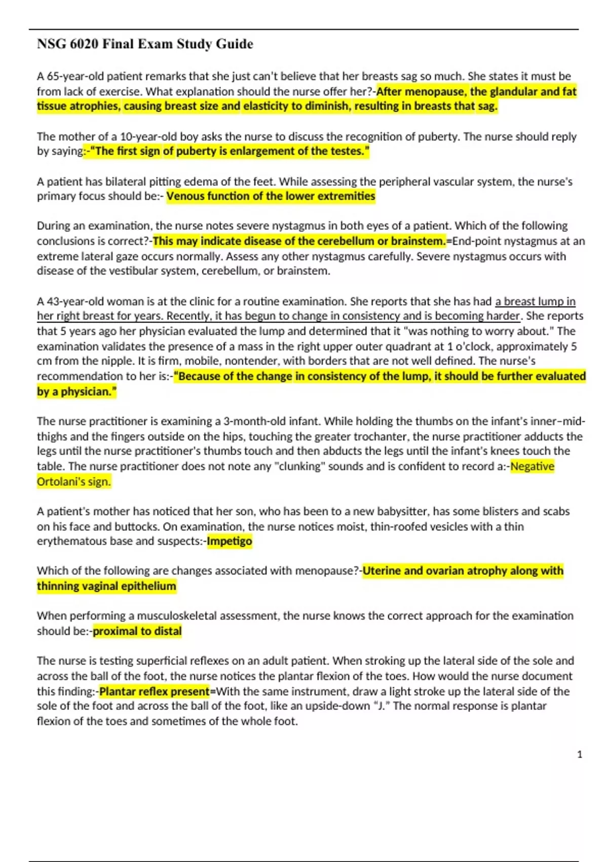 NSG 6020 Final Exam Study Guide A 65-year-old patient remarks that she just can’t believe that her breasts sag so much. She states it must be from lack of exercise. What explanation should the nurse offer her?-After menopause, the glandular and fat tissue atrophies, causing breast size and elasticity to diminish, resulting in breasts that sag. The mother of a 10-year-old boy asks the nurse to discuss the recognition of puberty. The nurse should reply by saying:-“The first sign of puberty is enlargement of the testes.” A patient has bilateral pitting edema of the feet. While assessing the peripheral vascular system, the nurse's primary focus should be:- Venous function of the lower extremities During an examination, the nurse notes severe nystagmus in both eyes of a patient. Which of the following conclusions is correct?-This may indicate disease of the cerebellum or brainstem.=End-point nystagmus at an extreme lateral gaze occurs normally. Assess any other nystagmus carefully. Severe nystagmus occurs with disease of the vestibular system, cerebellum, or brainstem. A 43-year-old woman is at the clinic for a routine examination. She reports that she has had a breast lump in her right breast for years. Recently, it has begun to change in consistency and is becoming harder. She reports that 5 years ago her physician evaluated the lump and determined that it “was nothing to worry about.” The examination validates the presence of a mass in the right upper outer quadrant at 1 o’clock, approximately 5 cm from the nipple. It is firm, mobile, nontender, with borders that are not well defined. The nurse’s recommendation to her is:-“Because of the change in consistency of the lump, it should be further evaluated by a physician.” The nurse practitioner is examining a 3-month-old infant. While holding the thumbs on the infant's inner–mid- thighs and the fingers outside on the hips, touching the greater trochanter, the nurse practitioner adducts the legs until the nurse practitioner's thumbs touch and then abducts the legs until the infant's knees touch the table. The nurse practitioner does not note any "clunking" sounds and is confident to record a:-Negative Ortolani's sign. A patient's mother has noticed that her son, who has been to a new babysitter, has some blisters and scabs on his face and buttocks. On examination, the nurse notices moist, thin-roofed vesicles with a thin erythematous base and suspects:-Impetigo Which of the following are changes associated with menopause?-Uterine and ovarian atrophy along with thinning vaginal epithelium When performing a musculoskeletal assessment, the nurse knows the correct approach for the examination should be:-proximal to distal The nurse is testing superficial reflexes on an adult patient. When stroking up the lateral side of the sole and across the ball of the foot, the nurse notices the plantar flexion of the toes. How would the nurse document this finding:-Plantar reflex present=With the same instrument, draw a light stroke up the lateral side of the sole of the foot and across the ball of the foot, like an upside-down “J.” The normal response is plantar flexion of the toes and sometimes of the whole foot. A woman is in the family planning clinic seeking birth control information. She states that her breasts “change all month long” and that she is worried that this is unusual. What is the nurse’s bestresponse?-Tell her that, because of the changing hormones during the monthly menstrual cycle, cyclic breast changes are common. A pt states during the interview that she noticed a new lump in the shower a few days ago. It was on her left breast near her axilla. The RN should plan to:-palpate the unaffected breast first A 16-yr-old girl is being seen at clinic for gastrointestinal complaints + weight loss. Nurse determines that many of her complaints may be related to erratic eating patterns, eating predominantly fast foods, + high caffeine intake. In this situation, which is most appropriate when collecting current dietary intake information?-Have the patient complete a food diary for 3 days—2 weekdays and 1 weekend day. To assess the head control of a 4-month-old infant, the nurse lifts the infant up in a prone position while supporting his chest. The nurse looks for what normal response?-Raises head and arches back.=At 3 months of age, the baby raises the head and arches the back as if in a swan dive. This is the Landau reflex, which persists until 11/2 years of age. A patient has a positive Homans' sign. The nurse knows that a positive Homans' sign may indicate:-deep vein thrombosis. The nurse is discussing breast self-examination with a postmenopausal woman. The best time for postmenopausal women to perform breast self-examination is:-the same day every month. A 15-year-old boy is seen in the clinic for complaints of “dull pain and pulling” in the scrotal area. On examination the nurse palpates a soft, irregular mass posterior to and above the testis on the left. This mass collapses when the patient is supine and refills when he is upright. This description is consistent with:- varicocele. The nurse is bathing an 80-year-old man and notices that his skin is wrinkled, thin, lax, and dry. This finding would be related to which factor?-An increased loss of elastin and a decrease in subcutaneous fat in the elderly A woman who is 22 weeks pregnant has a vaginal infection. She tells the nurse that she is afraid that this infection will hurt the fetus. The nurse knows that which of these statements is true?-A thick mucus plug forms that protects the fetus from infection. In assessment of 1-month-old, nurse notes a lack of response to noise or stimulation. mother reports that in the last week he has been sleeping all the time + when awake all he does is cry. nurse hears that infant’s cries are very high pitched and shrill. What would be nurse’s appropriate response?-Refer the infant for further testing.=A high-pitched 