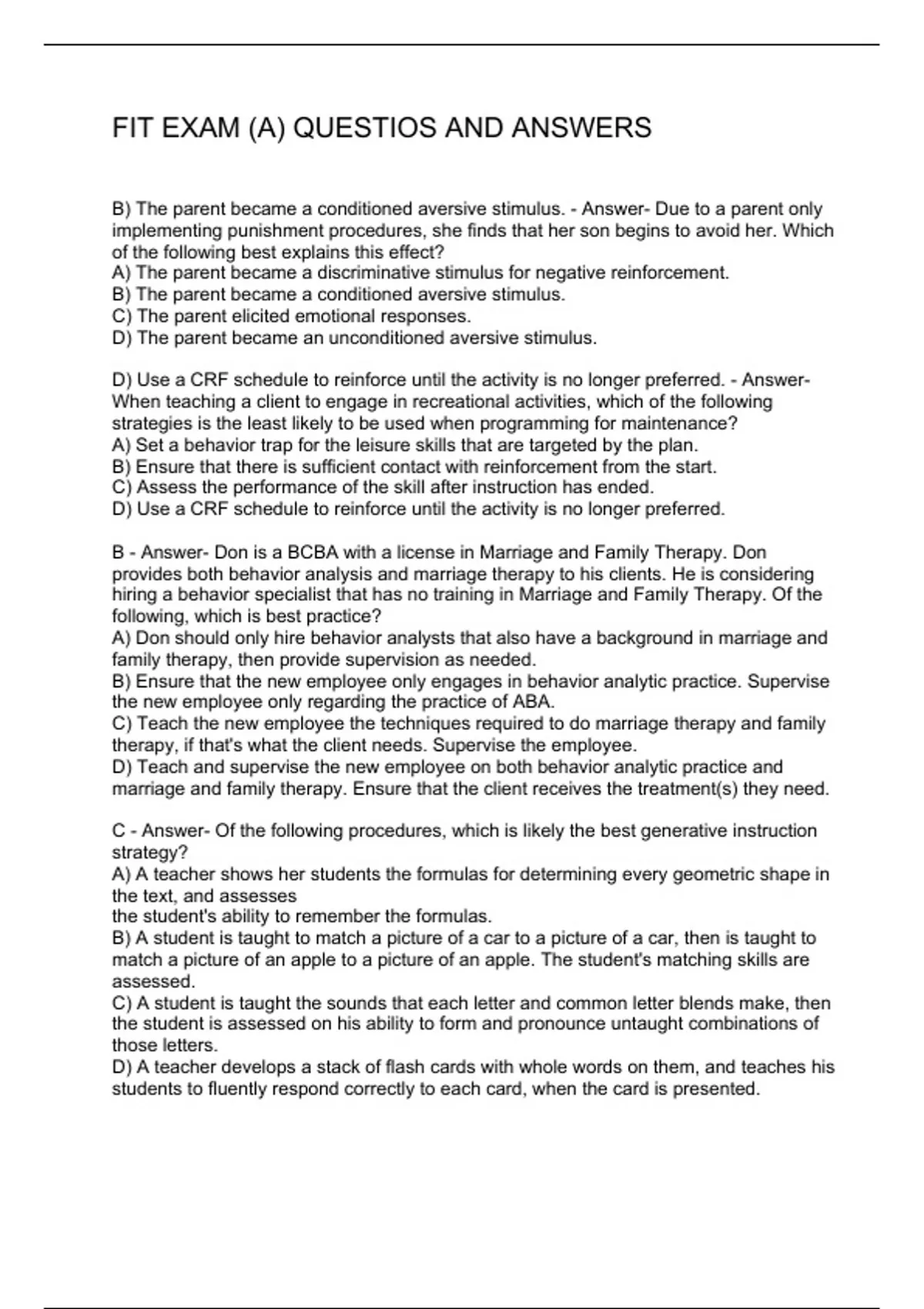 B) The parent became a conditioned aversive stimulus. - Answer- Due to a parent only implementing punishment procedures, she finds that her son begins to avoid her. Which of the following best explains this effect? A) The parent became a discriminative stimulus for negative reinforcement. B) The parent became a conditioned aversive stimulus. C) The parent elicited emotional responses. D) The parent became an unconditioned aversive stimulus. D) Use a CRF schedule to reinforce until the activity is no longer preferred. - Answer- When teaching a client to engage in recreational activities, which of the following strategies is the least likely to be used when programming for maintenance? A) Set a behavior trap for the leisure skills that are targeted by the plan. B) Ensure that there is sufficient contact with reinforcement from the start. C) Assess the performance of the skill after instruction has ended. D) Use a CRF schedule to reinforce until the activity is no longer preferred. B - Answer- Don is a BCBA with a license in Marriage and Family Therapy. Don provides both behavior analysis and marriage therapy to his clients. He is considering hiring a behavior specialist that has no training in Marriage and Family Therapy. Of the following, which is best practice? A) Don should only hire behavior analysts that also have a background in marriage and family therapy, then provide supervision as needed. B) Ensure that the new employee only engages in behavior analytic practice. Supervise the new employee only regarding the practice of ABA. C) Teach the new employee the techniques required to do marriage therapy and family therapy, if that's what the client needs. Supervise the employee. D) Teach and supervise the new employee on both behavior analytic practice and marriage and family therapy. Ensure that the client receives the treatment(s) they need. C - Answer- Of the following procedures, which is likely the best generative instruction strategy? A) A teacher shows her students the formulas for determining every geometric shape in the text, and assesses the student's ability to remember the formulas. B) A student is taught to match a picture of a car to a picture of a car, then is taught to match a picture of an apple to a picture of an apple. The student's matching skills are assessed. C) A student is taught the sounds that each letter and common letter blends make, then the student is assessed on his ability to form and pronounce untaught combinations of those letters. D) A teacher develops a stack of flash cards with whole words on them, and teaches his st