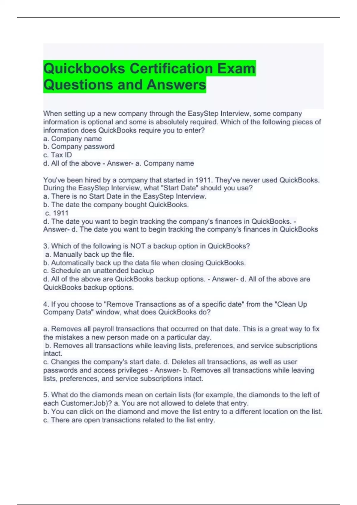 Quickbooks Certification Exam Questions and Answers