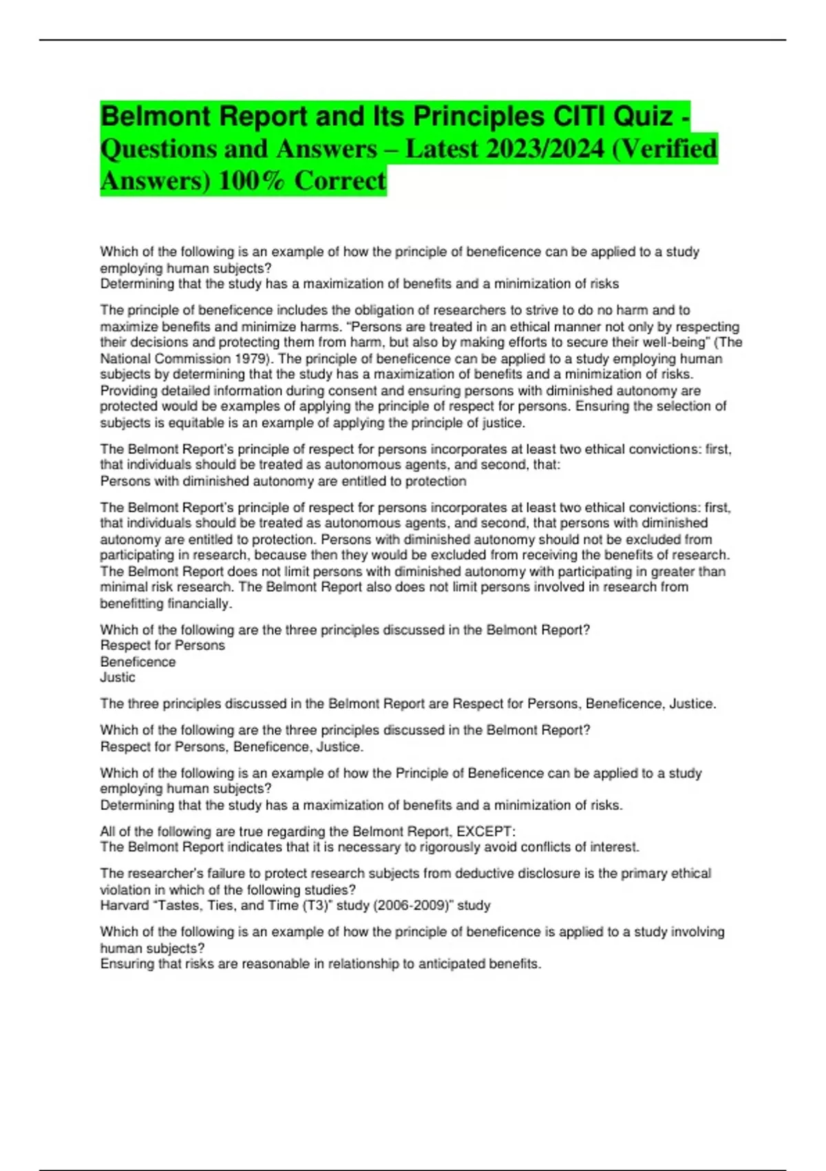 Belmont Report and Its Principles CITI Quiz -Questions and Answers – Latest 2023/2024 (Verified Answers) 100% Correct Which of the following is an example of how the principle of beneficence can be applied to a study employing human subjects? Determining that the study has a maximization of benefits and a minimization of risks The principle of beneficence includes the obligation of researchers to strive to do no harm and to maximize benefits and minimize harms. “Persons are treated in an ethical manner not only by respecting their decisions and protecting them from harm, but also by making efforts to secure their well-being” (The National Commission 1979). The principle of beneficence can be applied to a study employing human subjects by determining that the study has a maximization of benefits and a minimization of risks. Providing detailed information during consent and ensuring persons with diminished autonomy are protected would be examples of applying the principle of respect for persons. Ensuring the selection of subjects is equitable is an example of applying the principle of justice. The Belmont Report’s principle of respect for persons incorporates at least two ethical convictions: first, that individuals should be treated as autonomous agents, and second, that: Persons with diminished autonomy are entitled to protection The Belmont Report’s principle of respect for persons incorporates at least two ethical convictions: first, that individuals should be treated as autonomous agents, and second, that persons with diminished autonomy are entitled to protection. Persons with diminished autonomy should not be excluded from participating in research, because then they would be excluded from receiving the benefits of research. The Belmont Report does not limit persons with diminished autonomy with participating in greater than minimal risk research. The Belmont Report also does not limit persons involved in research from benefitting financially. Which of the following are the three principles discussed in the Belmont Report? Respect for Persons Beneficence Justic The three principles discussed in th