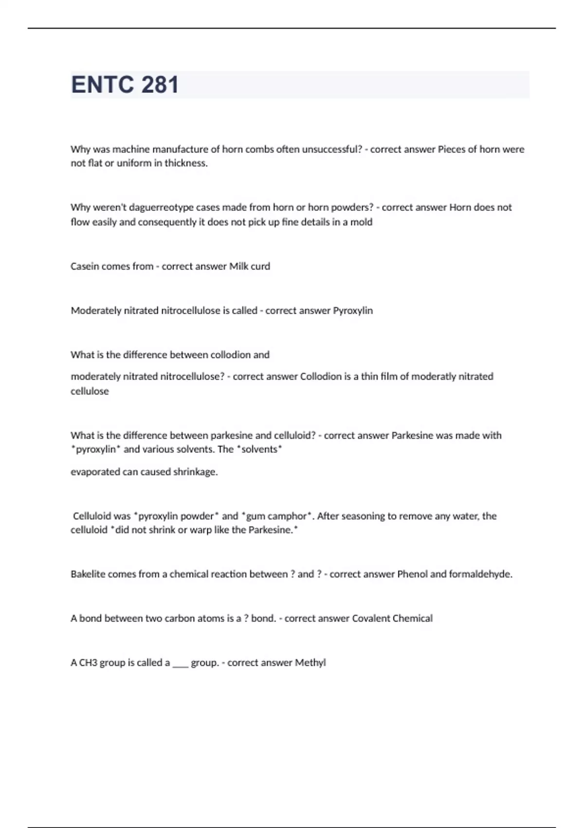 ENTC 281Why was machine manufacture of horn combs often unsuccessful? - correct answer Pieces of horn were not flat or uniform in thickness. Why weren't daguerreotype cases made from horn or horn powders? - correct answer Horn does not flow easily and consequently it does not pick up fine details in a mold Casein comes from - correct answer Milk curd Moderately nitrated nitrocellulose is called - correct answer Pyroxylin What is the difference between collodion and moderately nitrated nitrocellulose? - correct answer Collodion is a thin film of moderatly nitrated cellulose What is the difference between parkesine and celluloid? - correct answer Parkesine was made with *pyroxylin* and various solvents. The *solvents* evaporated can caused shrinkage. Celluloid was *pyroxylin powder* and *gum camphor*. After seasoning to remove any water, the celluloid *did not shrink or warp like the Parkesine.* Bakelite comes from a chemical reaction between ? and ? - correct answer Phenol and formaldehyde. A bond between two carbon atoms is a ? bond. - correct answer Covalent Chemical A CH3 group is called a ___ group. - correct answer Methyl