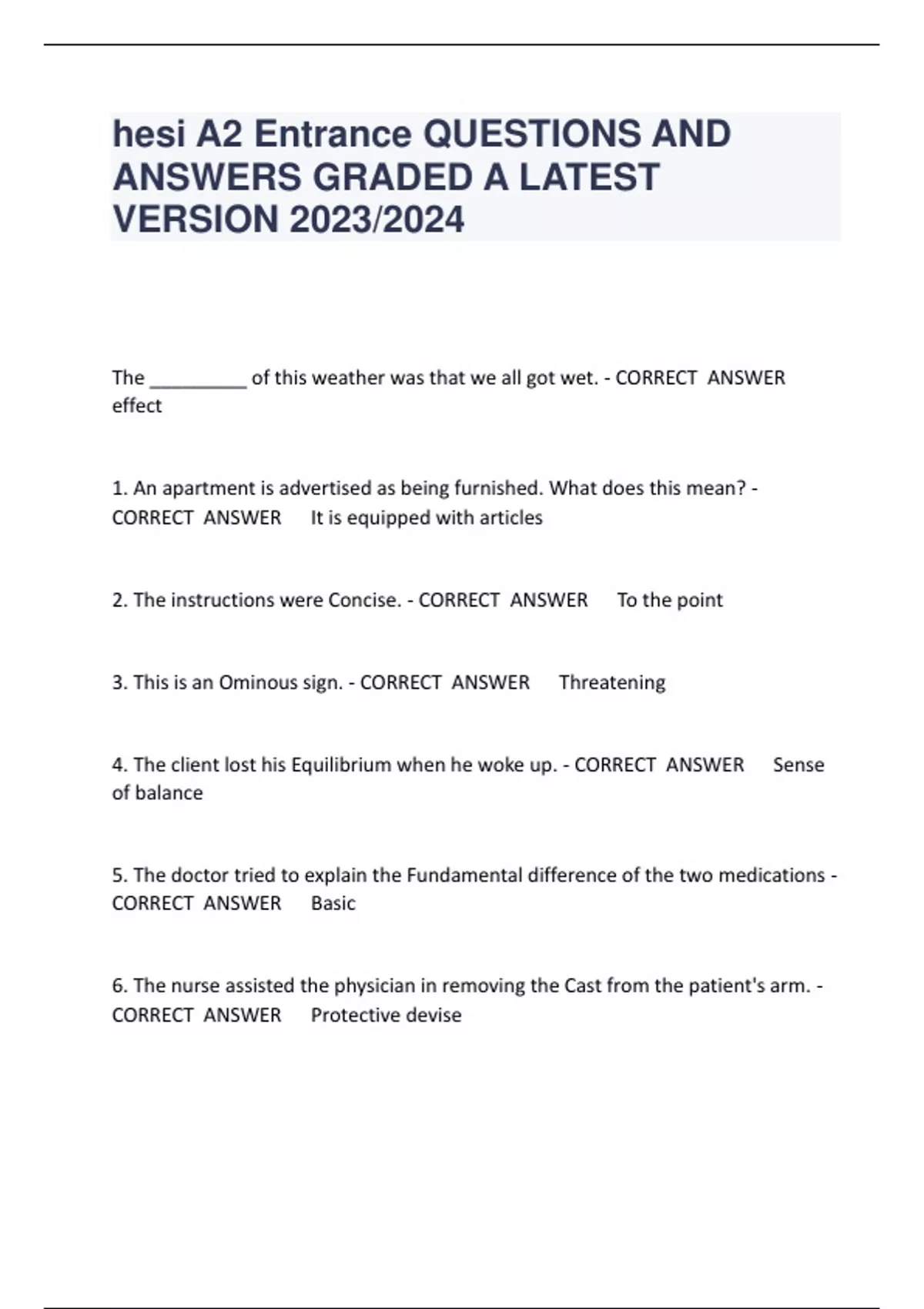 hesi A2 Entrance QUESTIONS AND ANSWERS GRADED A LATEST VERSION 2023/2024 The _________ of this weather was that we all got wet. - CORRECT ANSWER effect 1. An apartment is advertised as being furnished. What does this mean? - CORRECT ANSWER It is equipped with articles 2. The instructions were Concise. - CORRECT ANSWER To the point 3. This is an Ominous sign. - CORRECT ANSWER Threatening 4. The client lost his Equilibrium when he woke up. - CORRECT ANSWER Sense of balance 5. The doctor tried to explain the Fundamental difference of the two medications - CORRECT ANSWER Basic 6. The nurse assisted the physician in removing the Cast from the patient's arm. - CORRECT ANSWER Protective devis