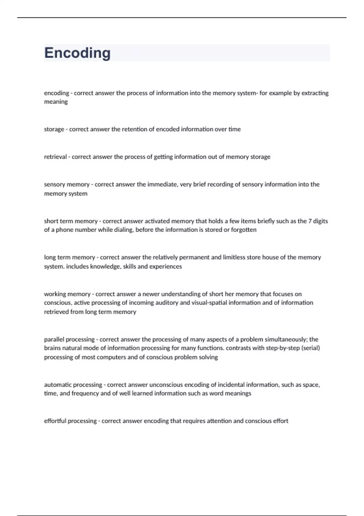 Encodingencoding - correct answer the process of information into the memory system- for example by extracting meaning storage - correct answer the retention of encoded information over time retrieval - correct answer the process of getting information out of memory storage sensory memory - correct answer the immediate, very brief recording of sensory information into the memory system short term memory - correct answer activated memory that holds a few items briefly such as the 7 digits of a phone number while dialing, before the information is stored or forgotten long term memory - correct answer the relatively permanent and limitless store house of the memory system. includes knowledge, skills and experiences working memory - correct answer a newer understanding of short her memory that focuses on conscious, active processing of incoming auditory and visual-spatial information and of information retrieved from long term memory parallel processing - correct answer the processing of many aspects of a problem simultaneously; the brains natural mode of information processing for many functions. contrasts with step-by-step (serial) processing of most computers and of conscious problem solving automatic processing - correct answer unconscious encoding of incidental information, such as space, time, and frequency and of well learned information such as word meanings effortful processing - correct answer encoding that requires attention and conscious effort