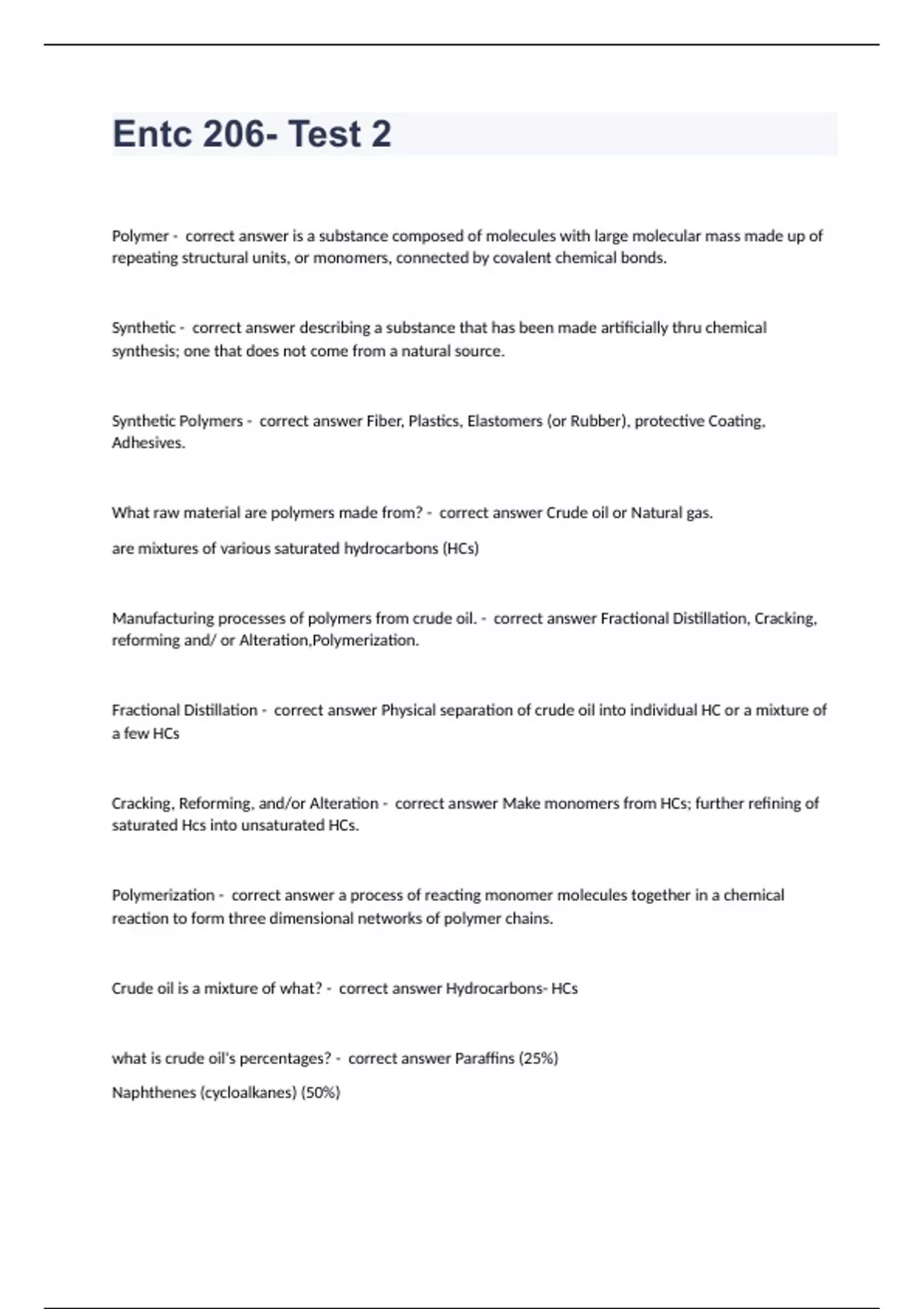 Entc 206- Test 2Polymer - correct answer is a substance composed of molecules with large molecular mass made up of repeating structural units, or monomers, connected by covalent chemical bonds. Synthetic - correct answer describing a substance that has been made artificially thru chemical synthesis; one that does not come from a natural source. Synthetic Polymers - correct answer Fiber, Plastics, Elastomers (or Rubber), protective Coating, Adhesives. What raw material are polymers made from? - correct answer Crude oil or Natural gas. are mixtures of various saturated hydrocarbons (HCs) Manufacturing processes of polymers from crude oil. - correct answer Fractional Distillation, Cracking, reforming and/ or Alteration,Polymerization. Fractional Distillation - correct answer Physical separation of crude oil into individual HC or a mixture of a few HCs Cracking, Reforming, and/or Alteration - correct answer Make monomers from HCs; further refining of saturated Hcs into unsaturated HCs. Polymerization - correct answer a process of reacting monomer molecules together in a chemical reaction to form three dimensional networks of polymer chains. Crude oil is a mixture of what? - correct answer Hydrocarbons- HCs what is crude oil's percentages? - correct answer Paraffins (25%) Naphthenes (cycloalkanes) (50%) Aromatics (17%) and other non-HCs. elements or compounds of Crude Oil - correct answer Carbon 84% Hydrogen 14% Sulfur 1-3% Nitorgen, Oxygen, Metals and salt (1%) Cracking - correct answer is the process that breaks down complex or heavy hydrocarbons into simpler or lighter ones by the breaking of carbon-carbon bonds using the combinations of heat, catalysts, and pressure. what is separated by distillation first? - correct answer Ethane is the first separated by distillation from crude oil. Then ethane is cracked by high temperature steam into ethylene, the monomer for polyethylene. Paraffins (alkanes, aliphatics) - correct answer are SATURATED hydrocarbons where all c-c bonds are SINGLE bonds. Natural HCs Methane (CH4) ethane (C2H6) Naphthenes(cycloalkane) - correct answer carbon atoms are arranged in a ring all c-c bonds are single bonds. Aromatics - correct answer Ringed structures with double bonds. (from crude oil) Natural HCs Benzene(C6H6) Toluene (C7H8) Olefins (alkenes) - correct answer are synthetic plastic monomers and unsaturated hydrocarbons containing at least one carbon to carbon double bond. ethylene (C2H4) Propylene (C3H6) Dienes( Diolefins) - correct answer Synthetic Rubber Monomer, contains two double bonds. Butadiene (C4H6) Isoprene (C5H8)