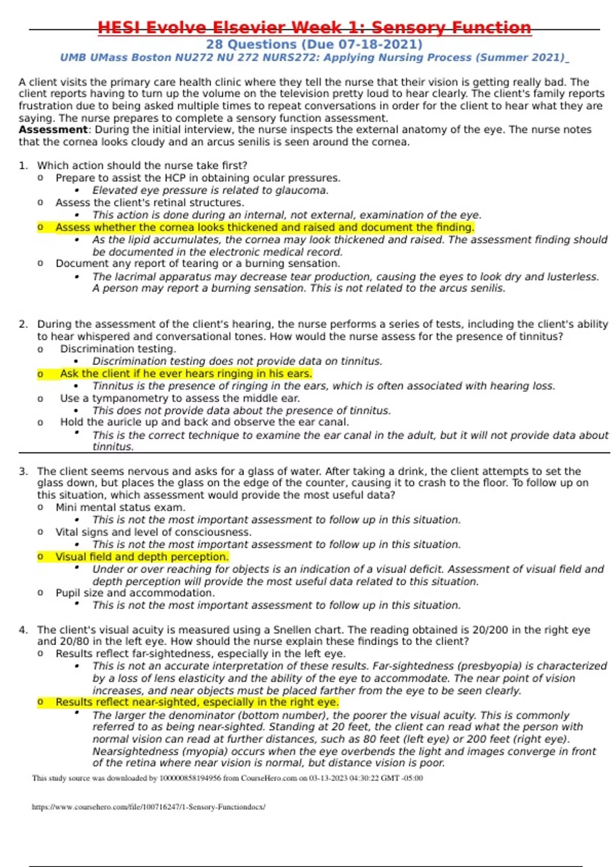 NU 272 HESI Evolve Elsevier Week 1 Sensory Function
