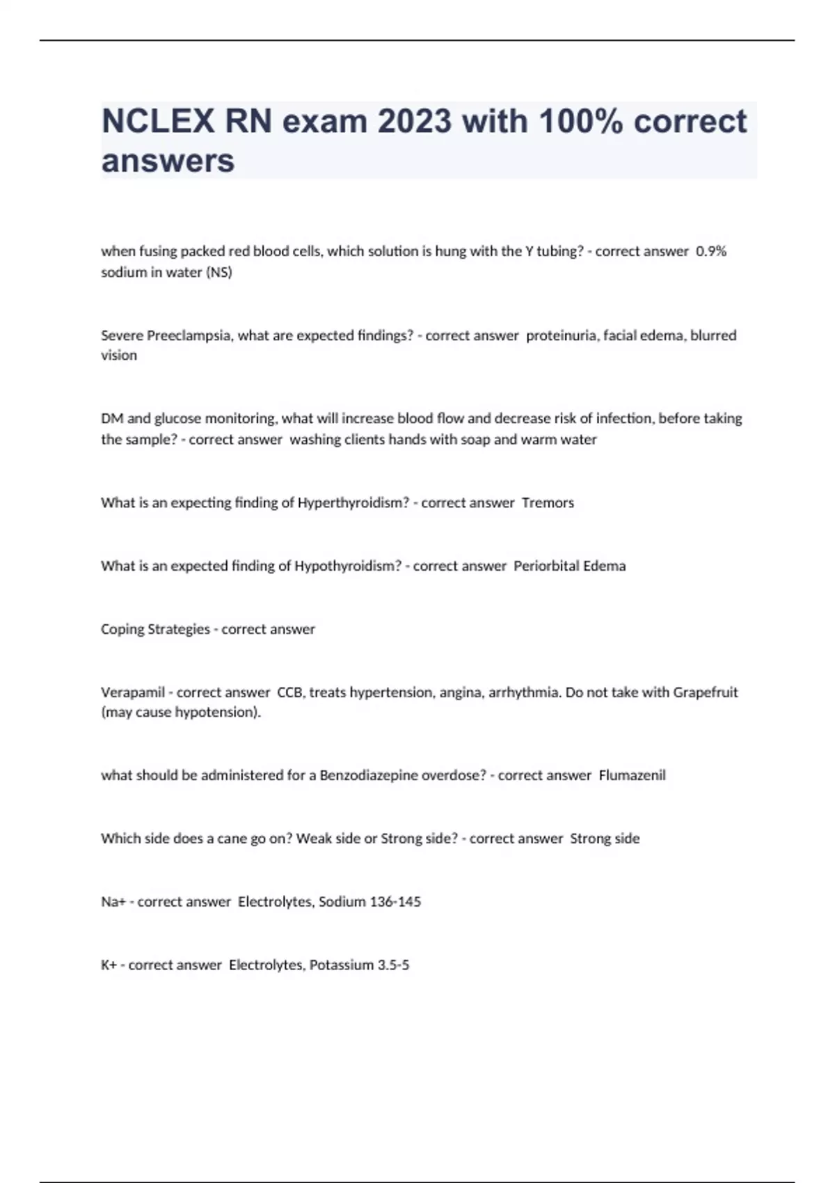 when fusing packed red blood cells, which solution is hung with the Y tubing? - correct answer 0.9% sodium in water (NS) Severe Preeclampsia, what are expected findings? - correct answer proteinuria, facial edema, blurred vision DM and glucose monitoring, what will increase blood flow and decrease risk of infection, before taking the sample? - correct answer washing clients hands with soap and warm water What is an expecting finding of Hyperthyroidism? - correct answer Tremors What is an expected finding of Hypothyroidism? - correct answer Periorbital Edema Coping Strategies - correct answer Verapamil - correct answer CCB, treats hypertension, angina, arrhythmia. Do not take with Grapefruit (may cause hypotension). what should be administered for a Benzodiazepine overdose? - correct answer Flumazenil Which side does a cane go on? Weak side or Strong side? - correct answer Strong side Na+ - correct answer Electrolytes, Sodium 136-145 K+ - correct answer Electrolytes, Potassium 3.5-5 Ca++ - correct answer Electrolytes, Calcium 9-10.5 pH - correct answer ABG, 7.35-7.45