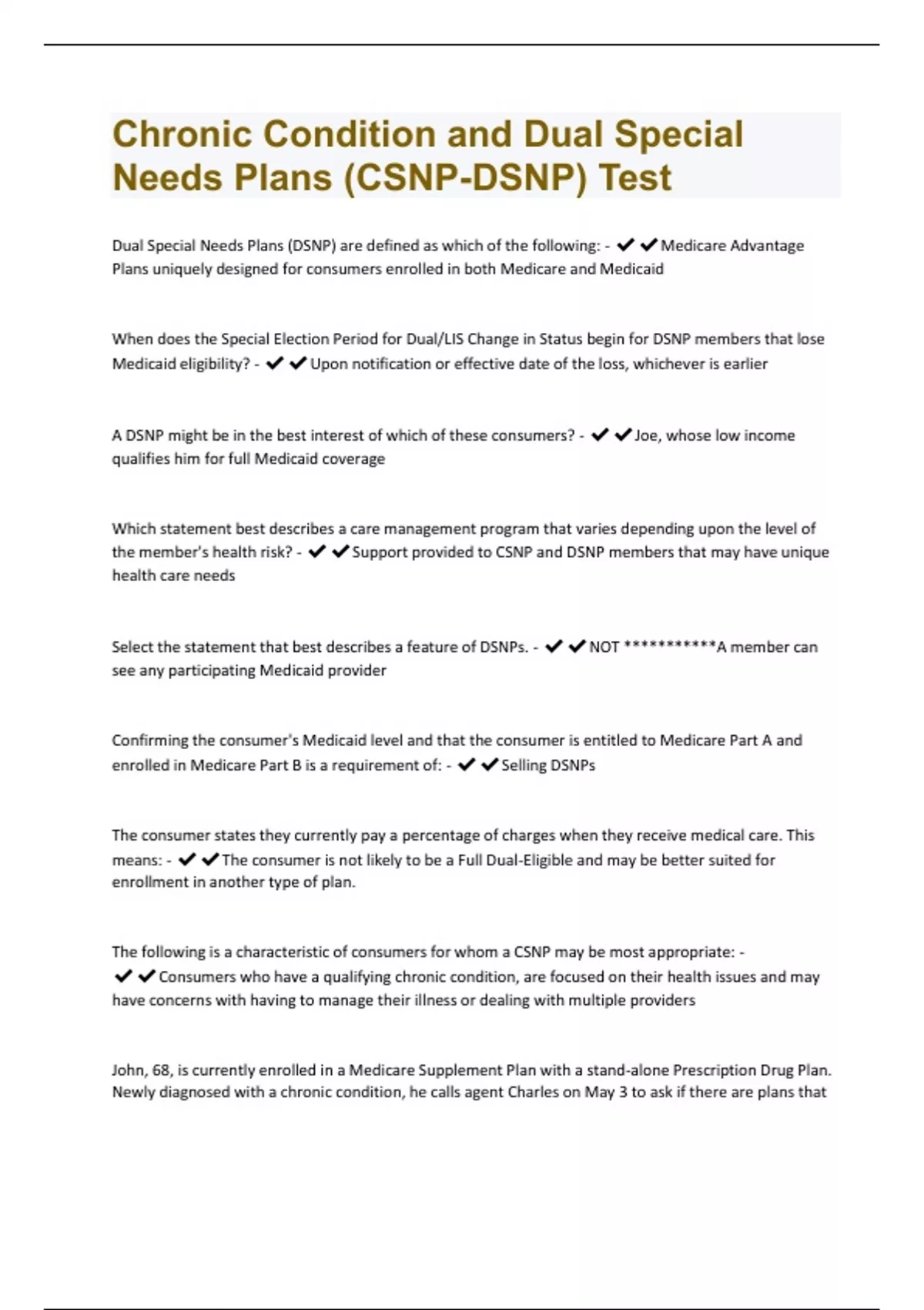 Chronic Condition and Dual Special Needs Plans (CSNP-DSNP) Test Questions and Answers with complete solution