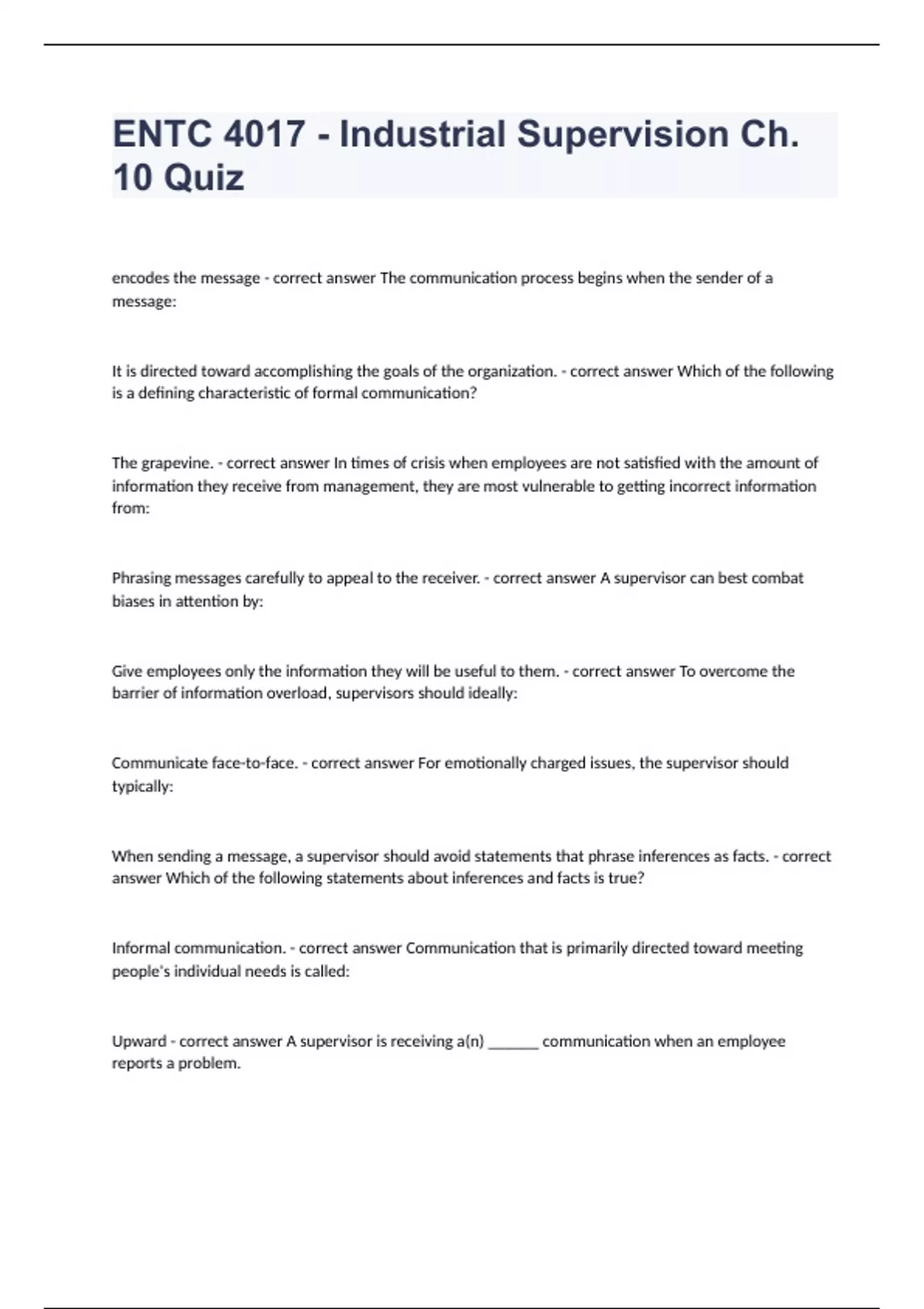 ENTC 4017 - Industrial Supervision Ch. 10 Quizencodes the message - correct answer The communication process begins when the sender of a message: It is directed toward accomplishing the goals of the organization. - correct answer Which of the following is a defining characteristic of formal communication? The grapevine. - correct answer In times of crisis when employees are not satisfied with the amount of information they receive from management, they are most vulnerable to getting incorrect information from: Phrasing messages carefully to appeal to the receiver. - correct answer A supervisor can best combat biases in attention by: Give employees only the information they will be useful to them. - correct answer To overcome the barrier of information overload, supervisors should ideally: Communicate face-to-face. - correct answer For emotionally charged issues, the supervisor should typically: When sending a message, a supervisor should avoid statements that phrase inferences as facts. - correct answer Which of the following statements about inferences and facts is true? Informal communication. - correct answer Communication that is primarily directed toward meeting people's individual needs is called: Upward - correct answer A supervisor is receiving a(n) ______ communication when an employee reports a problem. Use a suggestion box. - correct answer One method that supervisors can use to encourage upward communication is to: