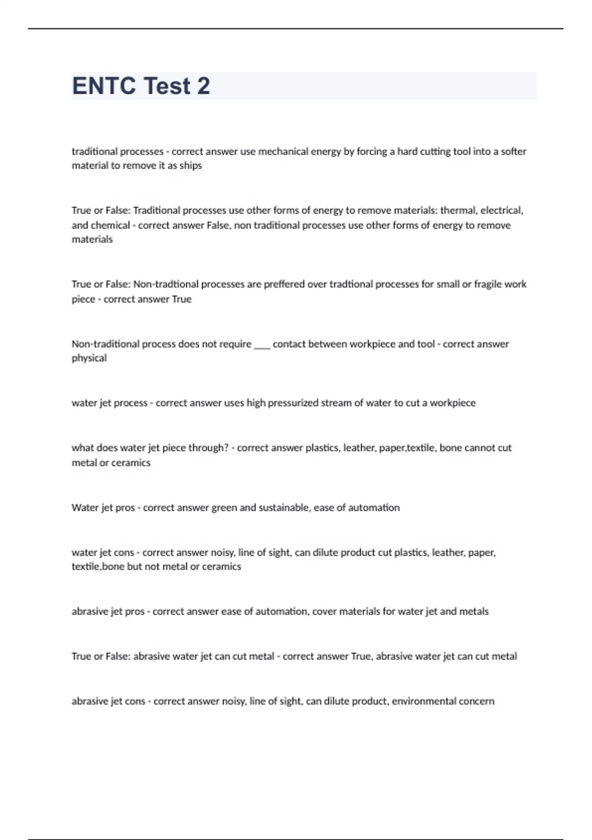 ENTC Test 2traditional processes - correct answer use mechanical energy by forcing a hard cutting tool into a softer material to remove it as ships True or False: Traditional processes use other forms of energy to remove materials: thermal, electrical, and chemical - correct answer False, non traditional processes use other forms of energy to remove materials True or False: Non-tradtional processes are preffered over tradtional processes for small or fragile work piece - correct answer True Non-traditional process does not require ___ contact between workpiece and tool - correct answer physical water jet process - correct answer uses high pressurized stream of water to cut a workpiece what does water jet piece through? - correct answer plastics, leather, paper,textile, bone cannot cut metal or ceramics Water jet pros - correct answer green and sustainable, ease of automation water jet cons - correct answer noisy, line of sight, can dilute product cut plastics, leather, paper, textile,bone but not metal or ceramics abrasive jet pros - correct answer ease of automation, cover materials for water jet and metals True or False: abrasive water jet can cut metal - correct answer True, abrasive water jet can cut metal abrasive jet cons - correct answer noisy, line of sight, can dilute product, environmental concern