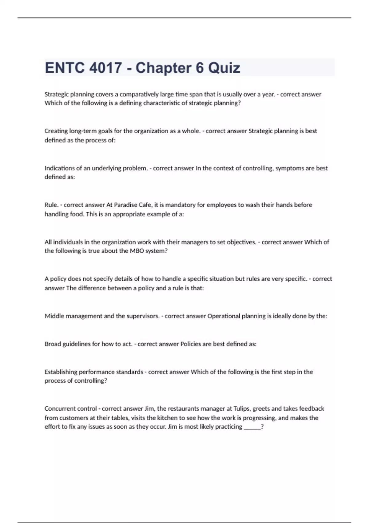 ENTC 4017 - Chapter 6 QuizStrategic planning covers a comparatively large time span that is usually over a year. - correct answer Which of the following is a defining characteristic of strategic planning? Creating long-term goals for the organization as a whole. - correct answer Strategic planning is best defined as the process of: Indications of an underlying problem. - correct answer In the context of controlling, symptoms are best defined as: Rule. - correct answer At Paradise Cafe, it is mandatory for employees to wash their hands before handling food. This is an appropriate example of a: All individuals in the organization work with their managers to set objectives. - correct answer Which of the following is true about the MBO system? A policy does not specify details of how to handle a specific situation but rules are very specific. - correct answer The difference between a policy and a rule is that: Middle management and the supervisors. - correct answer Operational planning is ideally done by the: Broad guidelines for how to act. - correct answer Policies are best defined as: Establishing performance standards - correct answer Which of the following is the first step in the process of controlling? Concurrent control - correct answer Jim, the restaurants manager at Tulips, greets and takes feedback from customers at their tables, visits the kitchen to see how the work is progressing, and makes the effort to fix any issues as soon as they occur. Jim is most likely practicing _____?