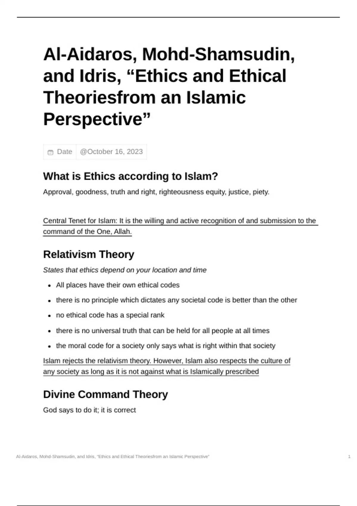 Notes on Al-Aidaros, Mohd-Shamsudin, and Idris, “Ethics and Ethical Theoriesfrom an Islamic Perspective”
