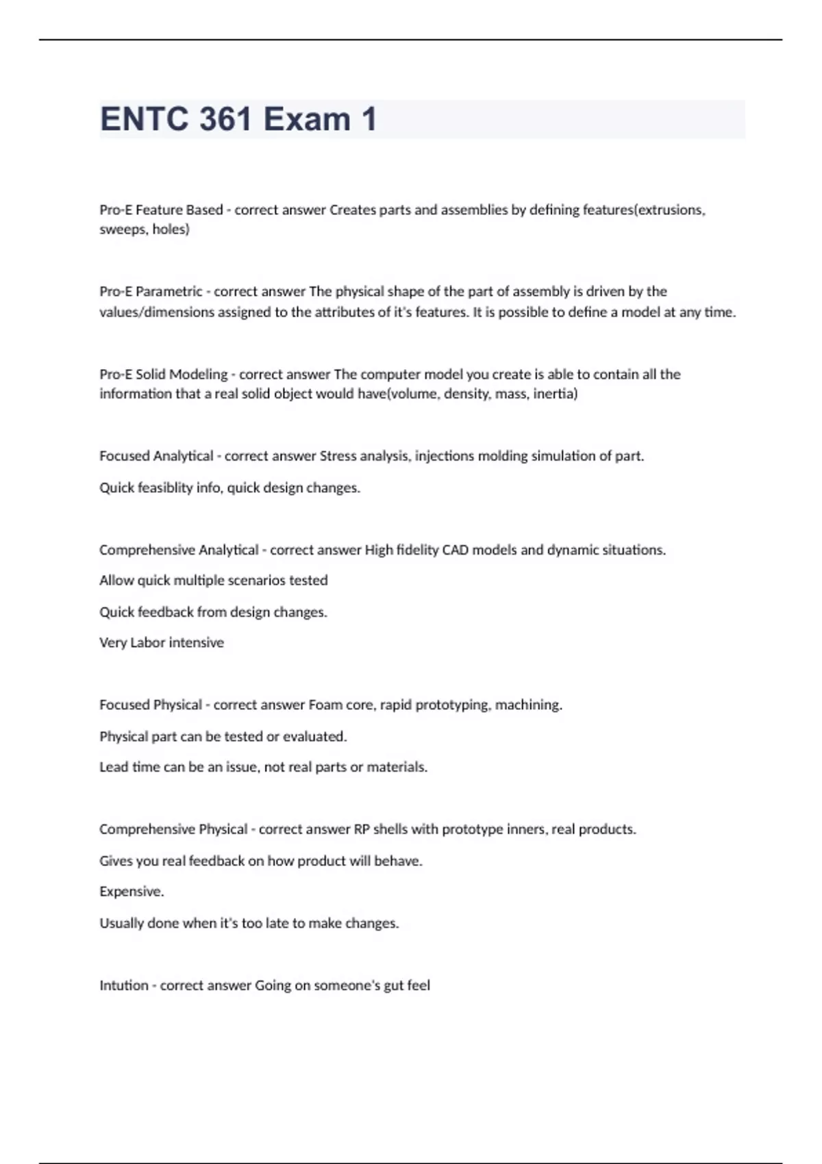 ENTC 361 Exam 1 Pro-E Feature Based - correct answer Creates parts and assemblies by defining features(extrusions, sweeps, holes) Pro-E Parametric - correct answer The physical shape of the part of assembly is driven by the values/dimensions assigned to the attributes of it's features. It is possible to define a model at any time. Pro-E Solid Modeling - correct answer The computer model you create is able to contain all the information that a real solid object would have(volume, density, mass, inertia) Focused Analytical - correct answer Stress analysis, injections molding simulation of part. Quick feasiblity info, quick design changes. Comprehensive Analytical - correct answer High fidelity CAD models and dynamic situations. Allow quick multiple scenarios tested Quick feedback from design changes. Very Labor intensive Focused Physical - correct answer Foam core, rapid prototyping, machining. Physical part can be tested or evaluated. Lead time can be an issue, not real parts or materials. Comprehensive Physical - correct answer RP shells with prototype inners, real products. Gives you real feedback on how product will behave. Expensive. Usually done when it's too late to make changes. Intution - correct answer Going on someone's gut feel Pros: very quick and easy Cons: no documentation, little buy-in for item Multi-Voting - correct answer People vote on concepts Pros: Straight forward, quantitative, democratic Cons: not all opnions created equal, little connection to customer. Brainstorming - correct answer People discuss positives and negatives of each concept. Pros: More info that multivoting and intution, allows for some type of hybridization, documented. Cons: Still somewhat subjective Prototype and Test - correct answer Actual working prototype is built and tested. Data collected and best performing prototype is chosen. Pros: Most info possible, quantitative, allows for hybridization, Cons: Very expensive, very time consuming Decisions Matrices - correct answer Concepts are evaluated based on customer input or functional requirements. Pros: Documented, quantitiative, allows for hybridization, related to what customer wants. Cons: Can be very time consuming, Slot Modularity - correct answer Interfaces are different, non-interchangeable Very product specific. Ex. Driver airbag for a specific vehicle Bus Modularity - correct answer Common bus with same interface Ex. USB or bluetooth Sectional Modularity - correct answer Physical elements attach to each other with universal interface. very interchangeable parts, can be integrated with other components in more than one way.