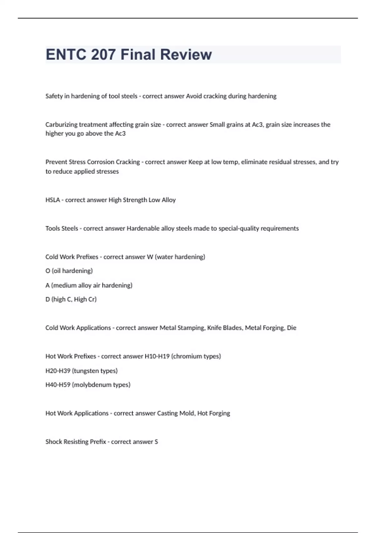 ENTC 207 Final Review Safety in hardening of tool steels - correct answer Avoid cracking during hardening Carburizing treatment affecting grain size - correct answer Small grains at Ac3, grain size increases the higher you go above the Ac3 Prevent Stress Corrosion Cracking - correct answer Keep at low temp, eliminate residual stresses, and try to reduce applied stresses HSLA - correct answer High Strength Low Alloy Tools Steels - correct answer Hardenable alloy steels made to special-quality requirements Cold Work Prefixes - correct answer W (water hardening) O (oil hardening) A (medium alloy air hardening) D (high C, High Cr) Cold Work Applications - correct answer Metal Stamping, Knife Blades, Metal Forging, Die Hot Work Prefixes - correct answer H10-H19 (chromium types) H20-H39 (tungsten types) H40-H59 (molybdenum types) Hot Work Applications - correct answer Casting Mold, Hot Forging Shock Resisting Prefix - correct answer S