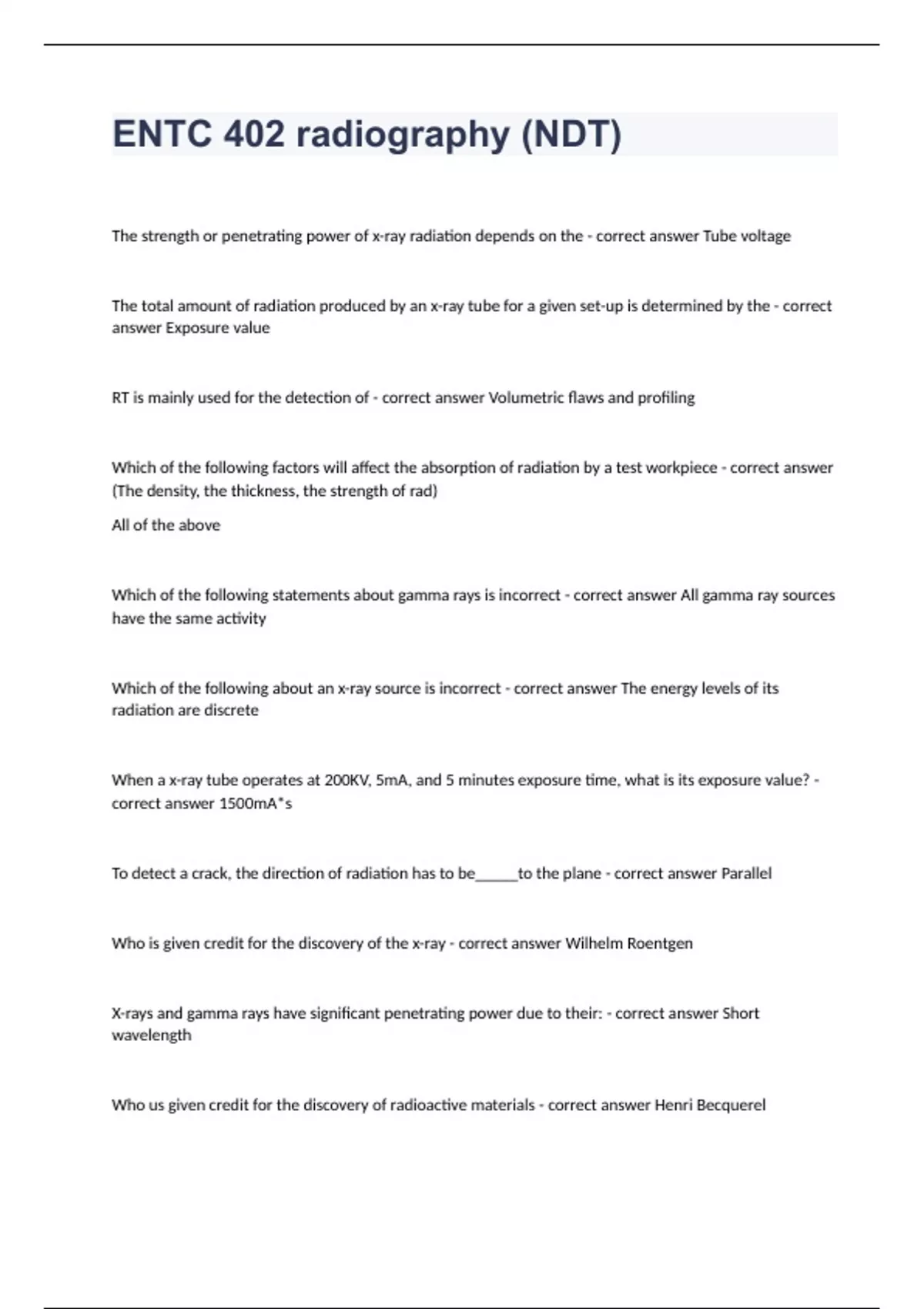 ENTC 402 radiography (NDT)The strength or penetrating power of x-ray radiation depends on the - correct answer Tube voltage The total amount of radiation produced by an x-ray tube for a given set-up is determined by the - correct answer Exposure value RT is mainly used for the detection of - correct answer Volumetric flaws and profiling Which of the following factors will affect the absorption of radiation by a test workpiece - correct answer (The density, the thickness, the strength of rad) All of the above Which of the following statements about gamma rays is incorrect - correct answer All gamma ray sources have the same activity Which of the following about an x-ray source is incorrect - correct answer The energy levels of its radiation are discrete When a x-ray tube operates at 200KV, 5mA, and 5 minutes exposure time, what is its exposure value? - correct answer 1500mA*s To detect a crack, the direction of radiation has to be_____to the plane - correct answer Parallel Who is given credit for the discovery of the x-ray - correct answer Wilhelm Roentgen X-rays and gamma rays have significant penetrating power due to their: - correct answer Short wavelength Who us given credit for the discovery of radioactive materials - correct answer Henri Becquerel