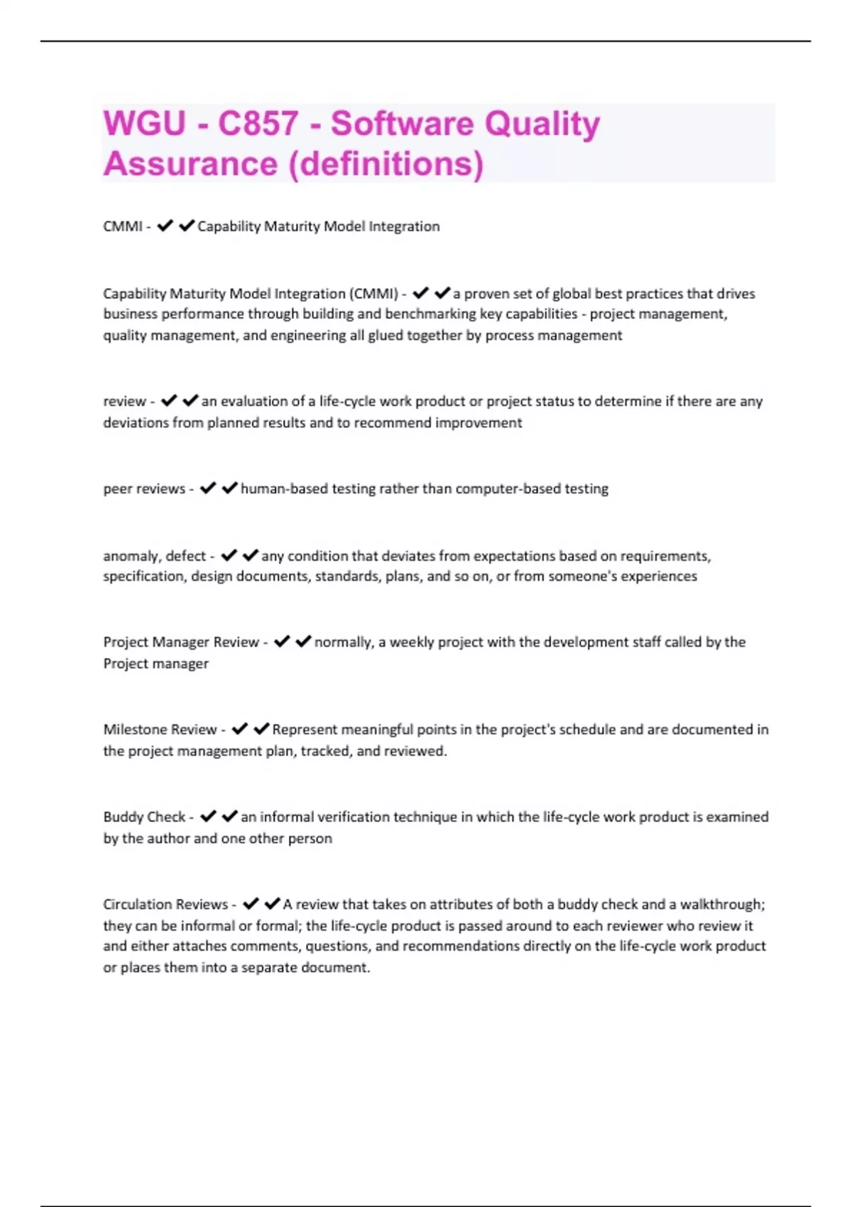 CMMI - Capability Maturity Model Integration Capability Maturity Model Integration (CMMI) - a proven set of global best practices that drives business performance through building and benchmarking key capabilities - project management, quality management, and engineering all glued together by process management review - an evaluation of a life-cycle work product or project status to determine if there are any deviations from planned results and to recommend improvement peer reviews - human-based testing rather than computer-based testing anomaly, defect - any condition that deviates from expectations based on requirements, specification, design documents, standards, plans, and so on, or from someone's experiences Project Manager Review - normally, a weekly project with the development staff called by the Project manager Milestone Review - Represent meaningful points in the project's schedule and are documented in the project management plan, tracked, and reviewed. Buddy Check - an informal verification technique in which the life-cycle work product is examined by the author and one other person Circulation Reviews - A review that takes on attributes of both a buddy check and a walkthrough; they can be informal or formal; the life-cycle product is passed around to each reviewer who review it and either attaches comments, questions, and recommendations directly on the life-cycle work product or places them into a separate document.Inspections - a formal verification technique in which life-cycle work products are examined in detail by a group of peers for the explicit purpose of detecting and identifying defects