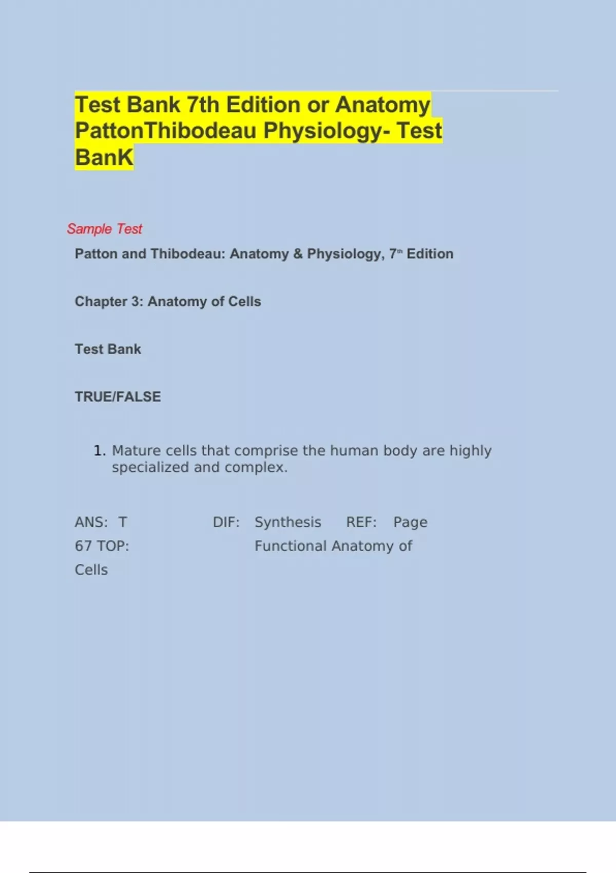 Patton and Thibodeau: Anatomy & Physiology, 7th Edition Chapter 3: Anatomy of Cells Test Bank TRUE/FALSE 1. Mature cells that comprise the human body are highly specialized and complex. ANS: T DIF: Synthesis REF: Page 67 TOP: Functional Anatomy of Cells 2. An important function of the cell membrane is the maintenance of cell integrity. ANS: T DIF: Synthesis REF: Page 69 (Table 3-3) TOP: Cell Membrane 3. Peroxisomes contain enzymes that detoxify harmful substances. ANS: T DIF: Memorization REF: Page 76 TOP: Peroxisomes 4. The outer portion of the cell membrane is hydrophobic, or water-loving. ANS: F DIF: Memorization REF: Page 70 TOP: Cell Membrane 5. Ribosomes attached to the endoplasmic reticulum are responsible for making proteins to be exported out of the cell. ANS: T DIF: Memorization REF: Page 73 TOP: Rough ER 6. The functions of the nucleus are regulated by RNA. ANS: F DIF: Memorization REF: Page 78 TOP: Nucleus 7. The major direct cell connections are tight junctions, gap junctions, and desmosomes. ANS: T DIF: Memorization REF: Page 83 TOP: Cell Connections 8. Tight junctions do not allow molecules to spread through the cracks between cells. ANS: T DIF: Memorization REF: Page 83 | Page 84 TOP: Cell Connections 9. Gap junctions are found in the small intestine. They allow molecules to flow between cells. ANS: F DIF: Memorization REF: Page 83 TOP: Cell Connections 10. The number of mitochondria in a cell is basically related to its degree of activity. ANS: T DIF: Memorization REF: Page 77 TOP: Mitochondria 11. The cell’s internal supporting framework is called the cytoskeleton. ANS: T DIF: Memorization REF: Page 79 TOP: Cytoskeleton 12. The size of a cell’s nucleolus is indirectly related to the amount of protein the cell produces. ANS: T DIF: Memorization REF: Page 78 TOP: Nucleus 13. Heart muscle cells are joined by gap junctions to facilitate the movement of electrical impulses. ANS: T DIF: Memorization REF: Page 83 TOP: Cell Connections 14. Cell connections called desmosomes are like Velcro holding cells together. ANS: T DIF: Memorization REF: Page 83 TOP: Cell Connections 15. Cilia are longer and more numerous than flagella. ANS: F DIF: Memorization REF: Page 82 TOP: Cell Extensions 16. Nucleic acid is DNA. ANS: F DIF: Memorization REF: Page 78 TOP: Nucleus 17. The thinnest cell fibers are tiny, hollow tubes called microtubules. ANS: F DIF: Memorization REF: Page 79 | Page 80 TOP: Cell Fibers 18. The plasma membrane can be described as a double layer of phospholipid molecules. ANS: T DIF: Synthesis REF: Page 70 TOP: Cell Membrane 19. Generally, the more active a cell is, the fewer mitochondria it will contain. ANS: F DIF: Application REF: Page 77 TOP: Mitochondria 20. Light microscopy is inferior to electron microscopy. ANS: T DIF: Synthesis REF: Page 80 (Figure 3-15) TOP: Cell Fibers 21. The “typical” cell described in Chapter 3 is very similar to most of the cells in the human body. ANS: F DIF: Memorization REF: Page 68 TOP: The Typical Cell 22. The watery fluid in the cell is called cytosol. ANS: T DIF: Memorization REF: Page 69 (Table 3-3) TOP: Cell Structures 23. Water-soluble substances easily pass through the cell membrane. ANS: F DIF: Memorization REF: Page 71 TOP: Cell Membrane 24. Glycoproteins on the cell membrane would prevent someone with type A blood from accepting type B blood. ANS: T DIF: Application REF: Page 72 TOP: Cell Membrane 25. Rough endoplasmic reticulum looks rough because there are mitochondria attached to it. ANS: F DIF: Memorization REF: Page 73 TOP: Endoplasmic Reticulum 26. Proteins in the cell membrane can control the movement of material through the cell membrane. ANS: T DIF: Memorization REF: Page 72 TOP: Cell Membrane 27. Smooth endoplasmic reticulum is the organelle that supplies membrane material for use throughout the cell. ANS: T DIF: Memorization REF: Page 74 TOP: Endoplasmic Reticulum 28. Ribosomes are only found attached to endoplasmic reticulum. ANS: F DIF: Memorization REF: Page 74 TOP: Ribosomes 29. The main function of the ribosome is to provide energy to the cell. ANS: F DIF: Memorization REF: Page 74 TOP: Ribosomes 30. The Golgi apparatus helps to prepare material for export from the cell. ANS: T DIF: Memorization REF: Page 74 TOP: Golgi Apparatus 31. The protein-processing units of the Golgi apparatus are called cisterna. ANS: T DIF: Memorization REF: Page 74 TOP: Golgi Apparatus 32. In certain situations, cells “commit suicide.” This function would be carried out by the lysosomes. ANS: T DIF: Application REF: Page 76 TOP: Lysosomes 33. The catalase in the peroxisomes reacts to detoxify carbon dioxide. ANS: F DIF: Memorization REF: Page 77 TOP: Peroxisomes 34. The inner folds of the mitochondria are called cisterna. ANS: F DIF: Memorization REF: Page 77 TOP: Mitochondria 35. It is likely that a muscle cell would have more mitochondria than a fat cell. ANS: T DIF: Application REF: Page 77 TOP: Mitochondria 36. One of the main functions of the mitochondria is to supply the cell with ATP. ANS: T DIF: Memorization REF: Page 77 TOP: Mitochondria 37. The name nucleus comes from the Greek word for color. ANS: F DIF: Memorization REF: Page 78 TOP: Nucleus 38. Chromosomes and chromatin are both forms of DNA. ANS: T DIF: Application REF: Page 78 TOP: Nucleus 39. Muscles contain a high concentration of microtubules. ANS: F DIF: Application REF: Page 80 TOP: Cell Fibers 40. The body of a female does not produce cells with flagella. ANS: T DIF: Application REF: Page 83 TOP: Cell Extensions 41. Schleiden and Schwann were the first scientists to see cells. ANS: F DIF: Memorization REF: Page 67 TOP: Introduction