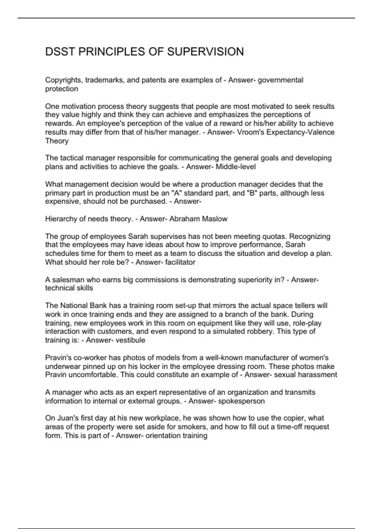 Copyrights, trademarks, and patents are examples of - Answer- governmental protection One motivation process theory suggests that people are most motivated to seek results they value highly and think they can achieve and emphasizes the perceptions of rewards. An employee's perception of the value of a reward or his/her ability to achieve results may differ from that of his/her manager. - Answer- Vroom's Expectancy-Valence Theory The tactical manager responsible for communicating the general goals and developing plans and activities to achieve the goals. - Answer- Middle-level What management decision would be where a production manager decides that the primary part in production must be an "A" standard part, and "B" parts, although less expensive, should not be purchased. - Answer- Hierarchy of needs theory. - Answer- Abraham Maslow The group of employees Sarah supervises has not been meeting quotas. Recognizing that the employees may have ideas about how to improve performance, Sarah schedules time for them to meet as a team to discuss the situation and develop a plan. What should her role be? - Answer- facilitator A salesman who earns big commissions is demonstrating superiority in? - Answer- technical skills The National Bank has a training room set-up that mirrors the actual space tellers will work in once training ends and they are assigned to a branch of the bank. During training, new employees work in this room on equipment like they will use, role-play interaction with customers, and even respond to a simulated robbery. This type of training is: - Answer- vestibule Pravin's co-worker has photos of models from a well-known manufacturer of women's underwear pinned up on his locker in the employee dressing room. These photos make Pravin uncomfortable. This could constitute an example of - Answer- sexual harassment A manager who acts as an expert representative of an organization and transmits information to internal or external groups. - Answer- spokesperson On Juan's first day at his new workplace, he was shown how to use the copier, what areas of the property were set aside for smokers, and how to fill out a time-off request form. This is part of - Answer- orientation training
