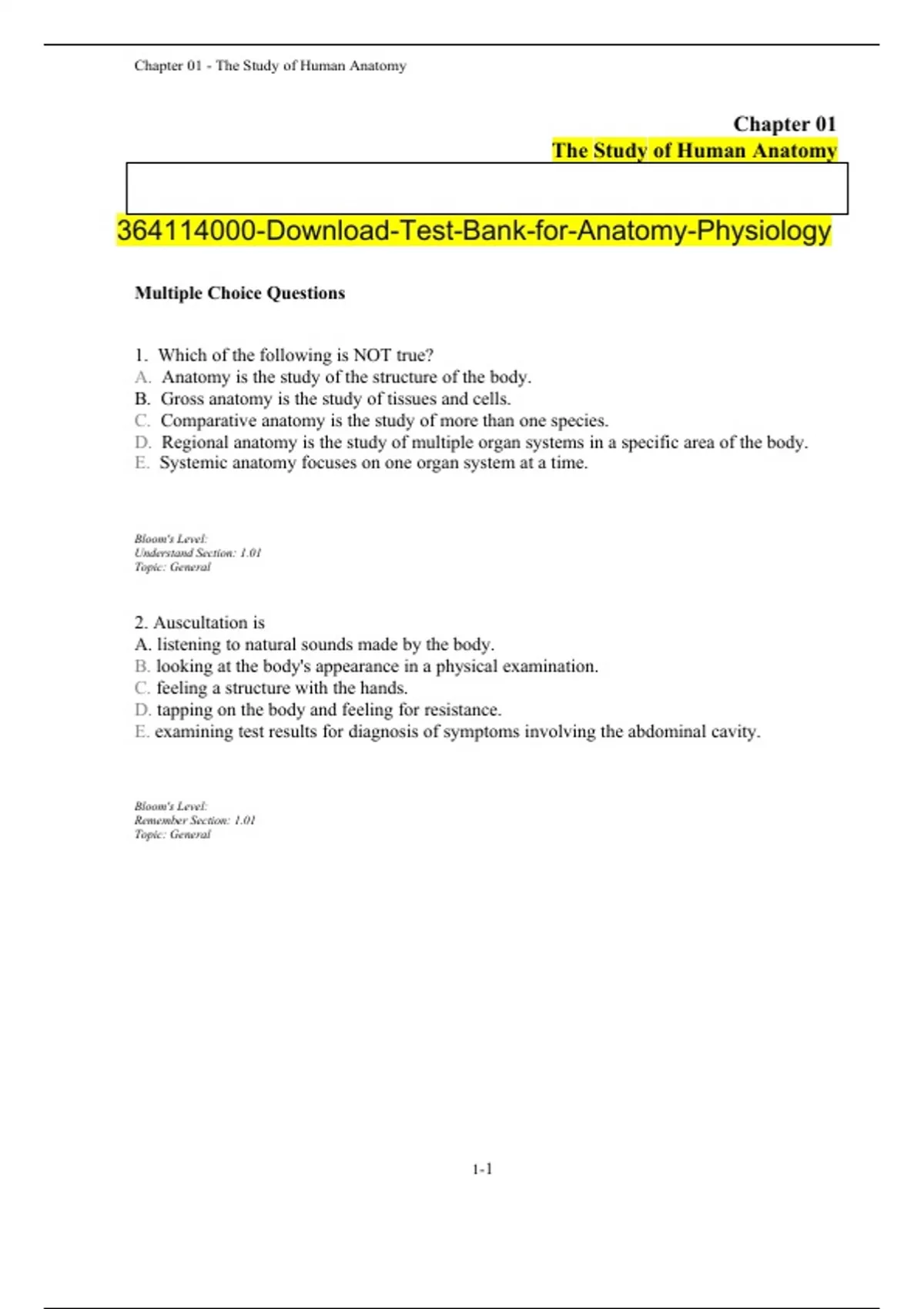 1. Which of the following is NOT true? A. Anatomy is the study of the structure of the body. B. Gross anatomy is the study of tissues and cells. C. Comparative anatomy is the study of more than one species. D. Regional anatomy is the study of multiple organ systems in a specific area of the body. E. Systemic anatomy focuses on one organ system at a time. Bloom's Level: Understand Section: 1.01 Topic: General 2. Auscultation is A. listening to natural sounds made by the body. B. looking at the body's appearance in a physical examination. C. feeling a structure with the hands. D. tapping on the body and feeling for resistance. E. examining test results for diagnosis of symptoms involving the abdominal cavity. Bloom's Level: Remember Section: 1.01 Topic: General 3. Which medical imaging technique relies on the injection of radioactively labeled glucose, and reveals which tissues are using the most glucose (and are most metabolically active)? A. Positive Emission Tomography (PET scan) B. Sonography C. Computed Tomography (CT Scan) D. Magnetic Resonance Imaging (MRI) E. Radiography Bloom's Level: Remember Section: 1.01 Topic: General 4. Which medical imaging technique relies on the absorption of high-energy radiation and reveals dense tissues such as bone and teeth? A. Positive Emission Tomography (PET scan) B. Sonography C. Computed Tomography (CT Scan) D. Magnetic Resonance Imaging (MRI) E. Radiography Bloom's Level: Remember Section: 1.01 Topic: General 5. Which medical imaging technique would be most useful for revealing a tumor in the brain? A. Computed Tomography (CT Scan) B. Radiography C. Sonography D. Echocardiography E. Either CT Scan or Sonography would be appropriate. Bloom's Level: Remember Section: 1.01 Topic: General 6. Which of the following lists the levels of human structure from smallest to largest? A. organelles, organisms, organs, organ systems B. organelles, cells, organs, tissues, organism C. cells, organisms, organelles, organs, organ systems D. cells, organs, tissues, organisms, organ systems E. organelles, cells, tissues, organs, organ systems Bloom's Level: Remember Section: 1.02 Topic: General 7. Study of the microscopic structure of tissues and organs is called A. cytology. B. gross anatomy. C. dissection. D. histology. E. auscultation. Bloom's Level: Remember Section: 1.01 Topic: General 8. You want to design a study to determine which part of the brain is most active when a person is forming a sentence before they say the words out loud. What imaging technique would be most useful for the study? A. Radiography B. Angiography C. Positron Emission Tomography (PET Scan) D. Computed Tomography (CT Scan) E. Sonography Bloom's Level: Understand Section: 1.01 Topic: General 9. An organ, by definition, is composed of two or more types of A. organelles. B. tissues. C. organ systems D. organisms. E. cells. Bloom's Level: Remember Section: 1.02 Topic: General 10. The roots of anatomical terminology lie mainly in A. Gaelic. B. Spanish and French. C. Latin and Greek. D. Russian and Finnish. E. Mandarin Chinese. Bloom's Level: Understand Section: 1.03 Topic: General 11. Why is the liver considered to be an organ? A. Because it is part of the digestive system. B. Because it has complex physiological functions. C. Because it is larger than a cell. D. Because it is composed of two or tissue types. E. Because it has a complex blood supply. Bloom's Level: Understand Section: 1.02 Topic: General 12. What is the smallest unit that carries out all life functions? A. organelle B. tissue C. molecule D. cell E. organ Bloom's Level: Remember Section: 1.02 Topic: General 13. The smallest structures that biologists consider to be living are A. organisms B. organs C. macromolecules D. cells E. organelles Bloom's Level: Remember Section: 1.02 Topic: General 14. Which imaging technique is most commonly used to view a fetus in utero? A. Radiography B. Computed Tomography (CT) C. Magnetic Resonance Imaging (MRI) D. Sonography E. Positron Emission Tomography (PET) Bloom's Level: Remember Section: 1.01 Topic: General 15. Situs inversus is a condition where A. an individual has no lenses in the eye. B. the kidney is flipped anterior to posterior. C. the organs of the thoracic and abdominal cavities are reversed between right and left. D. the appendix is affixed to the small intestine instead of the large intestine. E. an individual has incessant and painful heartburn. Bloom's Level: Remember Section: 1.01 Topic: General 16. Why are many anatomical terms based on Greek and Latin roots? A. because they are easy to spell B. because many terms are based on the names of Greek and Roman physicians C. because scientific investigation began in ancient Greece and Rome D. because modern-day scientists study Greek and Latin E. because Greek and Latin words are more descriptive than English words Bloom's Level: Remember Section: 1.03 Topic: General 17. Which organ system has the principal function of protection, water retention, thermoregulation, vitamin D synthesis, cutaneous sensation and nonverbal communication? A. Skeletal System B. Urinary System C. Integumentary System D. Muscular System Bloom's Level: Remember Section: 1.02 Topic: General 18. Which of the following is NOT distinguished as being a system of input and output A. Muscular System B. Respiratory System C. Digestive System D. Urinary System Bloom's Level: Understand Section: 1.02 Topic: Body Orientation 19. The directional language of anatomy begins with what assumption about the position of the body under consideration? A. It is in a prone position. B. It is in anatomical position. C. It is in a supine position. D. There are no assumptions made. Bloom's Level: Remember Section: 1.02 Topic: Body Orientation 20. Which of the following is NOT a criterion of Anatomical Position? A. Standing erect B. Feet flat on floor C. Arms over the head D. Eyes forward
