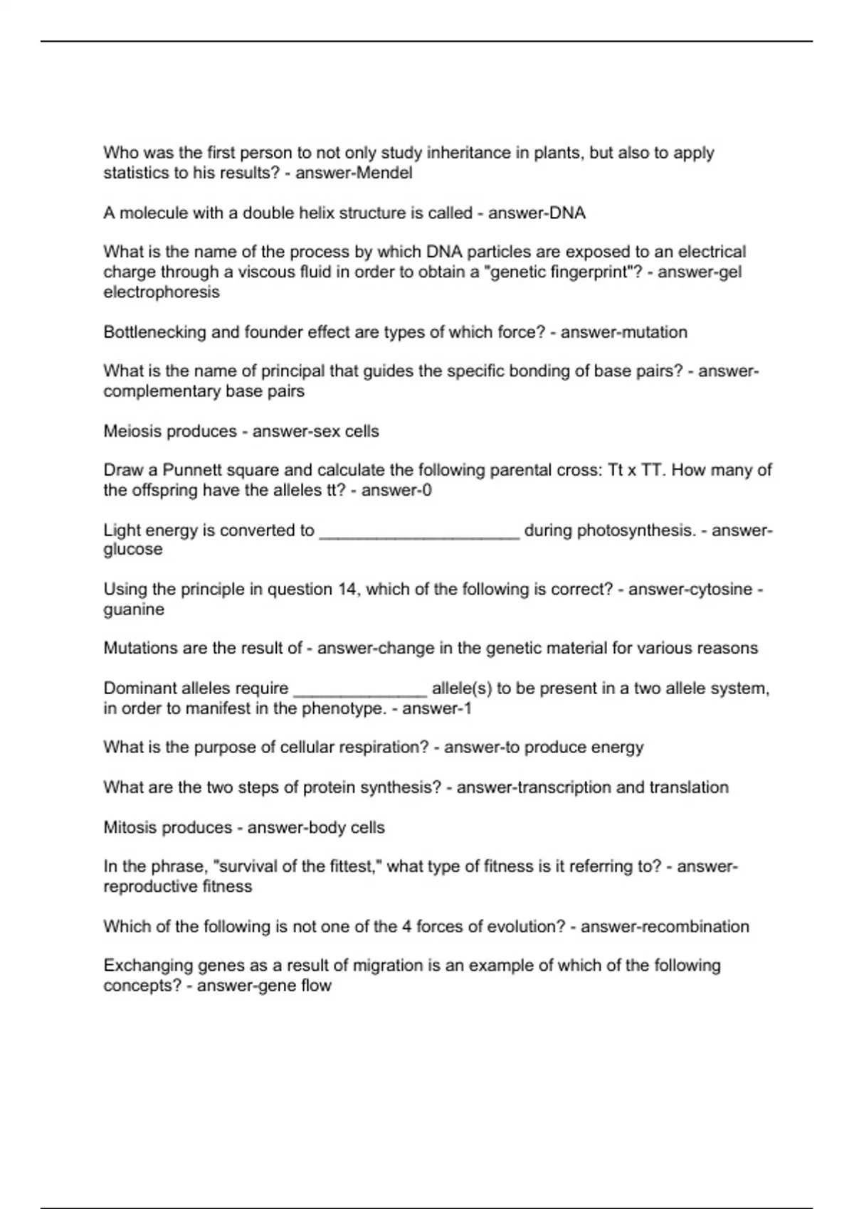 Who was the first person to not only study inheritance in plants, but also to apply statistics to his results? - answer-Mendel A molecule with a double helix structure is called - answer-DNA What is the name of the process by which DNA particles are exposed to an electrical charge through a viscous fluid in order to obtain a "genetic fingerprint"? - answer-gel electrophoresis Bottlenecking and founder effect are types of which force? - answer-mutation What is the name of principal that guides the specific bonding of base pairs? - answer-complementary base pairs Meiosis produces - answer-sex cells Draw a Punnett square and calculate the following parental cross: Tt x TT. How many of the offspring have the alleles tt? - answer-0 Light energy is converted to _____________________ during photosynthesis. - answer-glucose