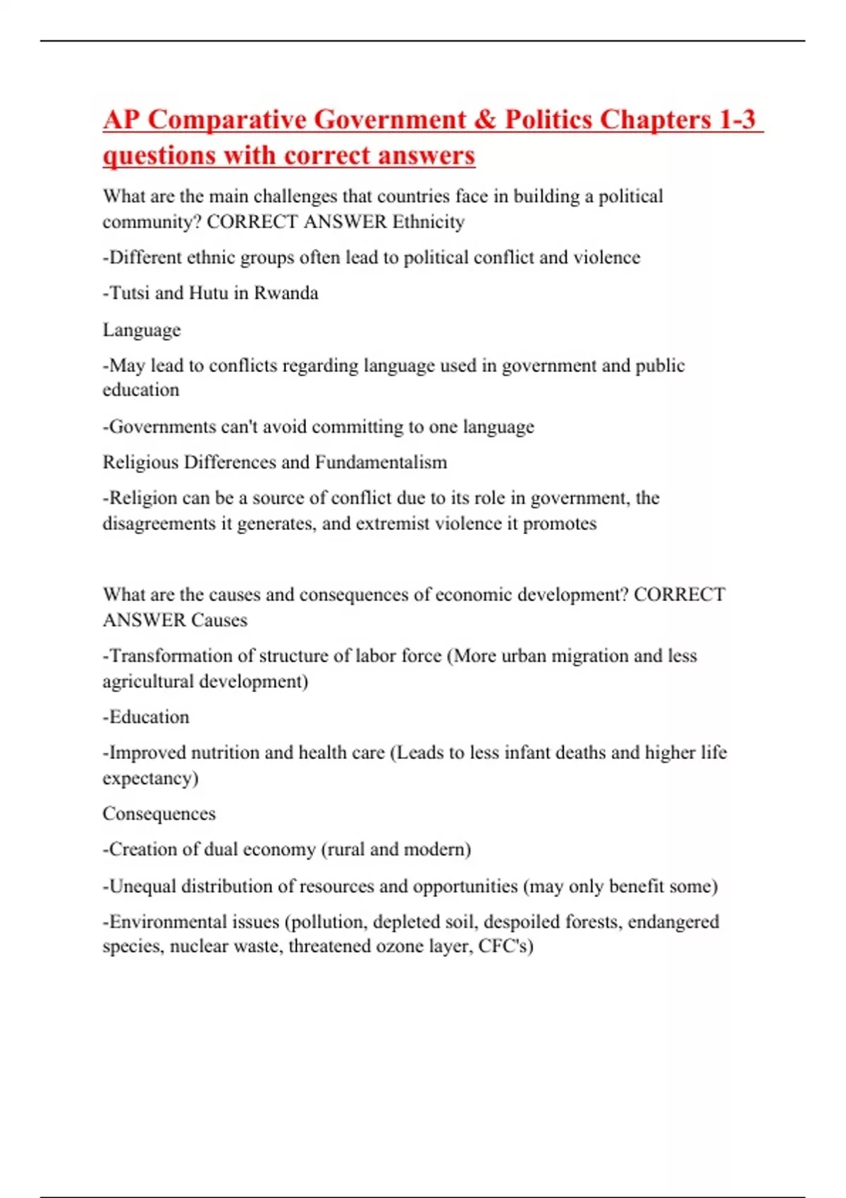 What are the main challenges that countries face in building a political community? CORRECT ANSWER Ethnicity -Different ethnic groups often lead to political conflict and violence -Tutsi and Hutu in Rwanda Language -May lead to conflicts regarding language used in government and public education -Governments can't avoid committing to one language Religious Differences and Fundamentalism -Religion can be a source of conflict due to its role in government, the disagreements it generates, and extremist violence it promotes What are the causes and consequences of economic development? CORRECT ANSWER Causes -Transformation of structure of labor force (More urban migration and less agricultural development) -Education -Improved nutrition and health care (Leads to less infant deaths and higher life expectancy) Consequences -Creation of dual economy (rural and modern) -Unequal distribution of resources and opportunities (may only benefit some) -Environmental issues (pollution, depleted soil, despoiled forests, endangered species, nuclear waste, threatened ozone layer, CFC's)