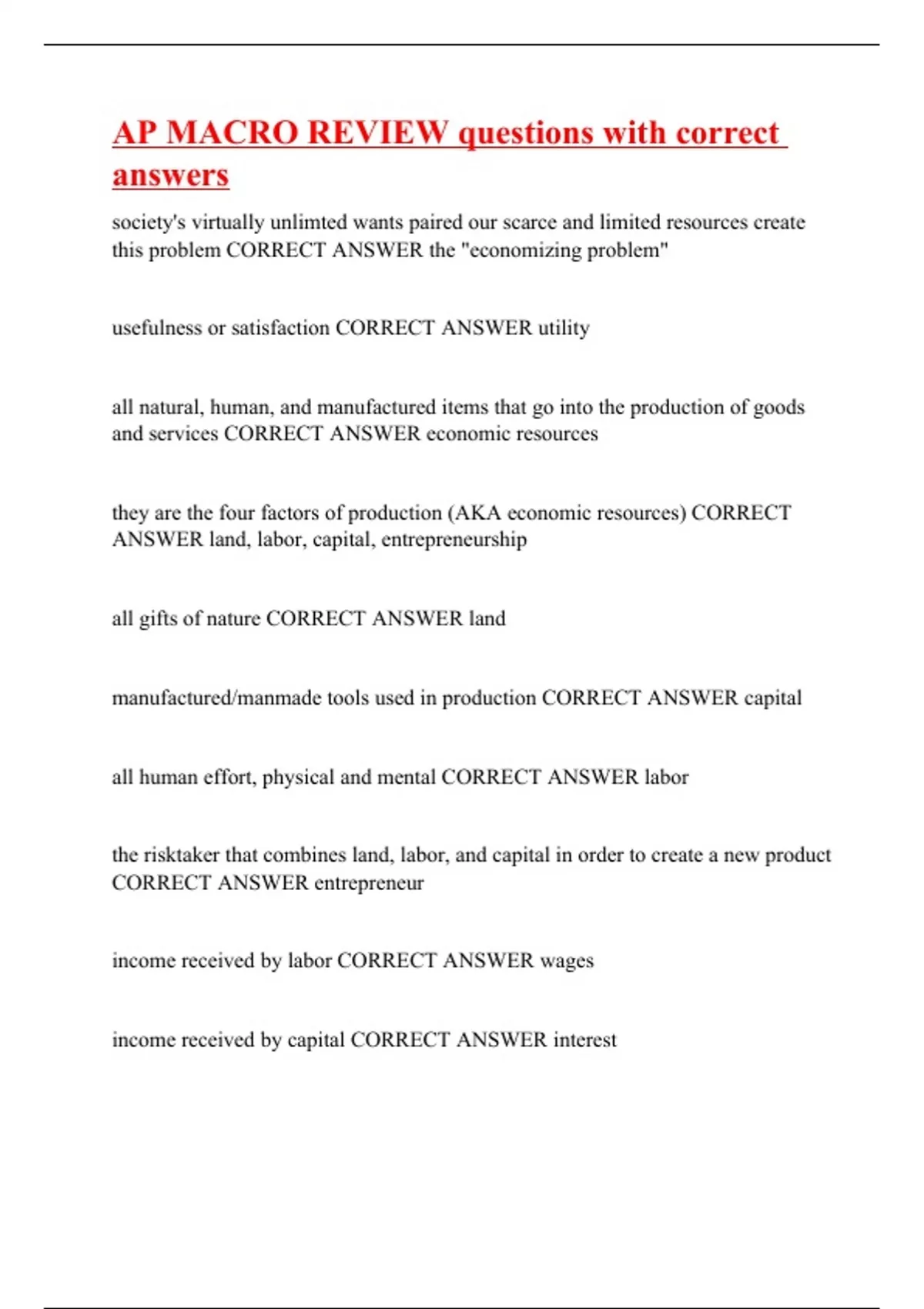 society's virtually unlimted wants paired our scarce and limited resources create this problem CORRECT ANSWER the "economizing problem" usefulness or satisfaction CORRECT ANSWER utility all natural, human, and manufactured items that go into the production of goods and services CORRECT ANSWER economic resources they are the four factors of production (AKA economic resources) CORRECT ANSWER land, labor, capital, entrepreneurship all gifts of nature CORRECT ANSWER land manufactured/manmade tools used in production CORRECT ANSWER capital all human effort, physical and mental CORRECT ANSWER labor the risktaker that combines land, labor, and capital in order to create a new product CORRECT ANSWER entrepreneur income received by labor CORRECT ANSWER wages income received by capital CORRECT ANSWER interest