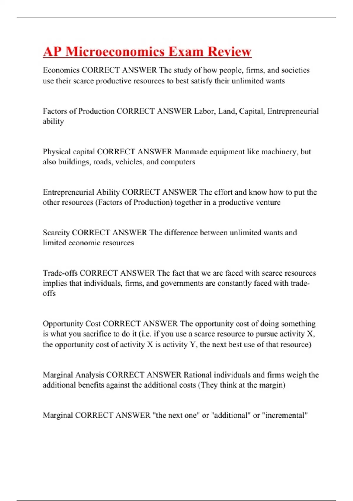 Economics CORRECT ANSWER The study of how people, firms, and societies use their scarce productive resources to best satisfy their unlimited wants Factors of Production CORRECT ANSWER Labor, Land, Capital, Entrepreneurial ability Physical capital CORRECT ANSWER Manmade equipment like machinery, but also buildings, roads, vehicles, and computers Entrepreneurial Ability CORRECT ANSWER The effort and know how to put the other resources (Factors of Production) together in a productive venture Scarcity CORRECT ANSWER The difference between unlimited wants and limited economic resources Trade-offs CORRECT ANSWER The fact that we are faced with scarce resources implies that individuals, firms, and governments are constantly faced with trade-offs Opportunity Cost CORRECT ANSWER The opportunity cost of doing something is what you sacrifice to do it (i.e. if you use a scarce resource to pursue activity X, the opportunity cost of activity X is activity Y, the next best use of that resource) Marginal Analysis CORRECT ANSWER Rational individuals and firms weigh the additional benefits against the additional costs (They think at the margin) Marginal CORRECT ANSWER "th