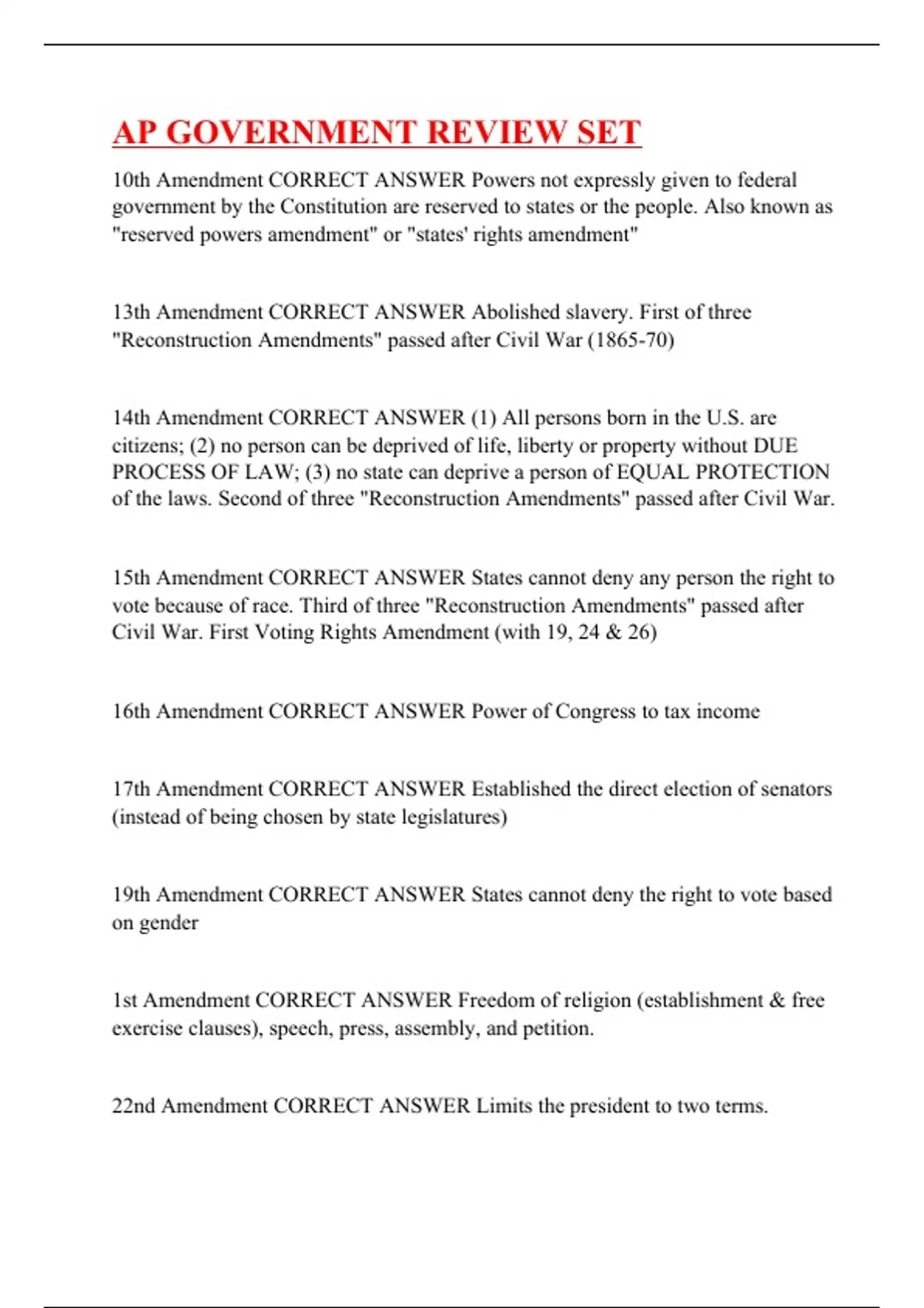 10th Amendment CORRECT ANSWER Powers not expressly given to federal government by the Constitution are reserved to states or the people. Also known as "reserved powers amendment" or "states' rights amendment" 13th Amendment CORRECT ANSWER Abolished slavery. First of three "Reconstruction Amendments" passed after Civil War (1865-70) 14th Amendment CORRECT ANSWER (1) All persons born in the U.S. are citizens; (2) no person can be deprived of life, liberty or property without DUE PROCESS OF LAW; (3) no state can deprive a person of EQUAL PROTECTION of the laws. Second of three "Reconstruction Amendments" passed after Civil War. 15th Amendment CORRECT ANSWER States cannot deny any person the right to vote because of race. Third of three "Reconstruction Amendments" passed after Civil War. First Voting Rights Amendment (with 19, 24 & 26) 16th Amendment CORRECT ANSWER Power of Congress to tax income 17th Amendment CORRECT ANSWER Established the direct election of senators (instead of being chosen by state legislatures) 19th Amendment CORRECT ANSWER States cannot deny the right to vote based on gender 1st Amendment CORRECT ANSWER Freedom of religion (establishment & free exercise clauses), speech, press, assembly, and petition. 22nd Amendment CORRECT ANSW