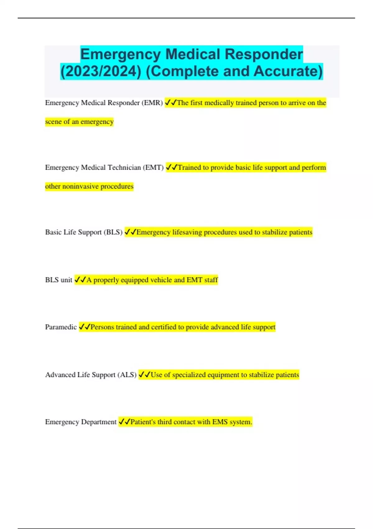 Emergency Medical Responder (2023/2024) (Complete and Accurate) Emergency Medical Responder (EMR) The first medically trained person to arrive on the scene of an emergency Emergency Medical Technician (EMT) Trained to provide basic life support and perform other noninvasive procedures Basic Life Support (BLS) Emergency lifesaving procedures used to stabilize patients BLS unit A properly equipped vehicle and EMT staff Paramedic Persons trained and certified to provide advanced life support Advanced Life Support (ALS) Use of specialized equipment to stabilize patients Emergency Department Patient's third contact with EMS system. Ten Standard Components of an EMS System -Regulation and policy -Resource management -Human resources and training -Transportation equipment and systems -Medical and support facilities -Communications system -Public information and education -Medical direction -Trauma system and development -Evaluation Transport Patient's condition requires care by medical professionals, but speed is not required. Patient is stable Prompt transport Patient's condition is serious enough that they need to go to an appropriate facility in a short period of time. Patient's condition may get worse and die Rapid transport EMS personnel unable to give adequate life-saving care in the field. Patient may die unless he/she is transported immediately to an appropriate medical facility Roles and Responsibilities of the EMR (16) -Respond promptly and safely to the scene of an accident or sudden illness. -Ensure that the scene is safe from hazards. -Protect yourself. -Protect the incident scene & patients from further harm. -Summon appropriate assistance. -Gain access to the patient. -Perform patient assessment. -Administer emergency medical care. -Provide reassurance to patients and family members. -Move patients only when necessary. -Seek and then direct help from bystanders, if necessary. -Control activities of bystanders. -Assist EMTs and paramedics as necessary. -Maintain continuity of patient care. -Document your care. -Keep your knowledge and skills up to date. Four goals of EMR training -Know what you should not do -Know how to use your EMR Life Support Kit -Know how to improvise -Know how to assist other EMS providers Documentation should be... -clear -concise -accurate -readable -according to the accepted policies of your organization Documentation should include -The condition of the patient when found -The patient's description of the injury or illness (c/c) -Initial and later vital signs -Treatment given -The agency and personnel who took over treatment of the patient