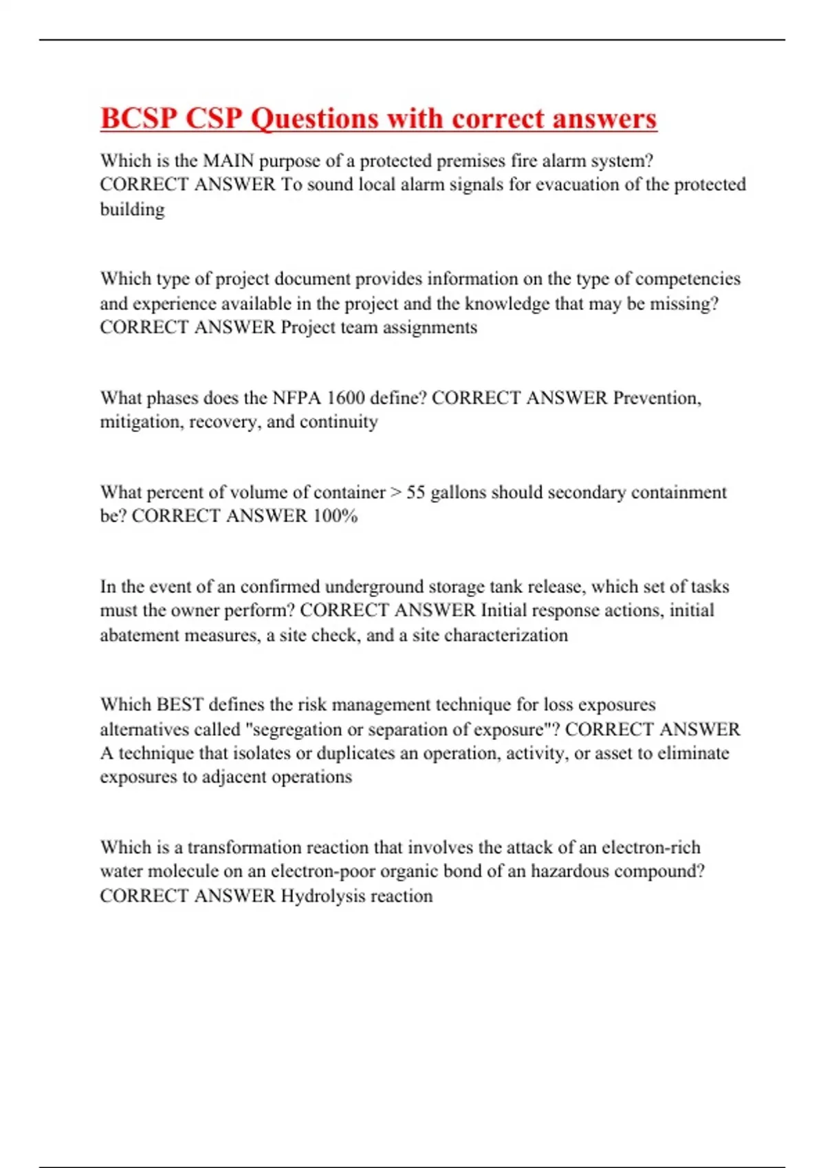 Which is the MAIN purpose of a protected premises fire alarm system? CORRECT ANSWER To sound local alarm signals for evacuation of the protected building Which type of project document provides information on the type of competencies and experience available in the project and the knowledge that may be missing? CORRECT ANSWER Project team assignments What phases does the NFPA 1600 define? CORRECT ANSWER Prevention, mitigation, recovery, and continuity What percent of volume of container 55 gallons should secondary containment be? CORRECT ANSWER 100% In the event of an confirmed underground storage tank release, which set of tasks must the owner perform? CORRECT ANSWER Initial response actions, initial abatement measures, a site check, and a site characterization Which BEST defines the risk management technique for loss exposures alternatives called "segregation or separation of exposure"? CORRECT ANSWER A technique that isolates or duplicates an operation, activity, or asset to eliminate exposures to adjacent operations Which is a transformation reaction that involves the attack of an electron-rich water molecule on an electron-poor organic bond of an hazardous compound? CORRECT ANSWER Hydrolysis reaction