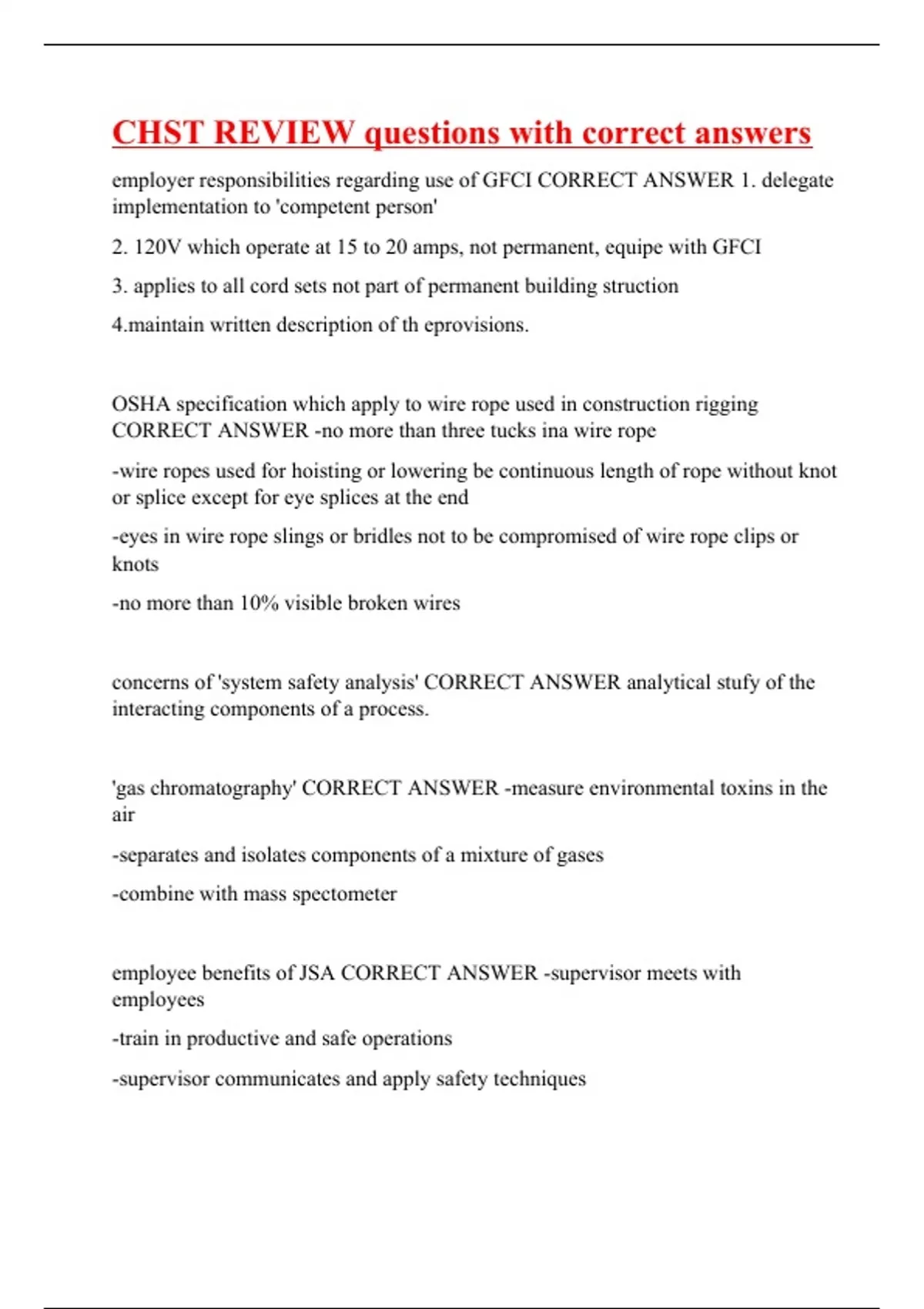employer responsibilities regarding use of GFCI CORRECT ANSWER 1. delegate implementation to 'competent person' 2. 120V which operate at 15 to 20 amps, not permanent, equipe with GFCI 3. applies to all cord sets not part of permanent building struction ain written description of th eprovisions. OSHA specification which apply to wire rope used in construction rigging CORRECT ANSWER -no more than three tucks ina wire rope -wire ropes used for hoisting or lowering be continuous length of rope without knot or splice except for eye splices at the end -eyes in wire rope slings or bridles not to be compromised of wire rope clips or knots -no more than 10% visible broken wires concerns of 'system safety analysis' CORRECT ANSWER analytical stufy of the interacting components of a process. 'gas chromatography' CORRECT ANSWER -measure environmental toxins in the air -separates and isolates components of a mixture of gases -combine with mass spectometer employee benefits of JSA CORRECT ANSWER -supervisor meets with employees -train in productive and safe operations -supervisor communicates and apply safety t