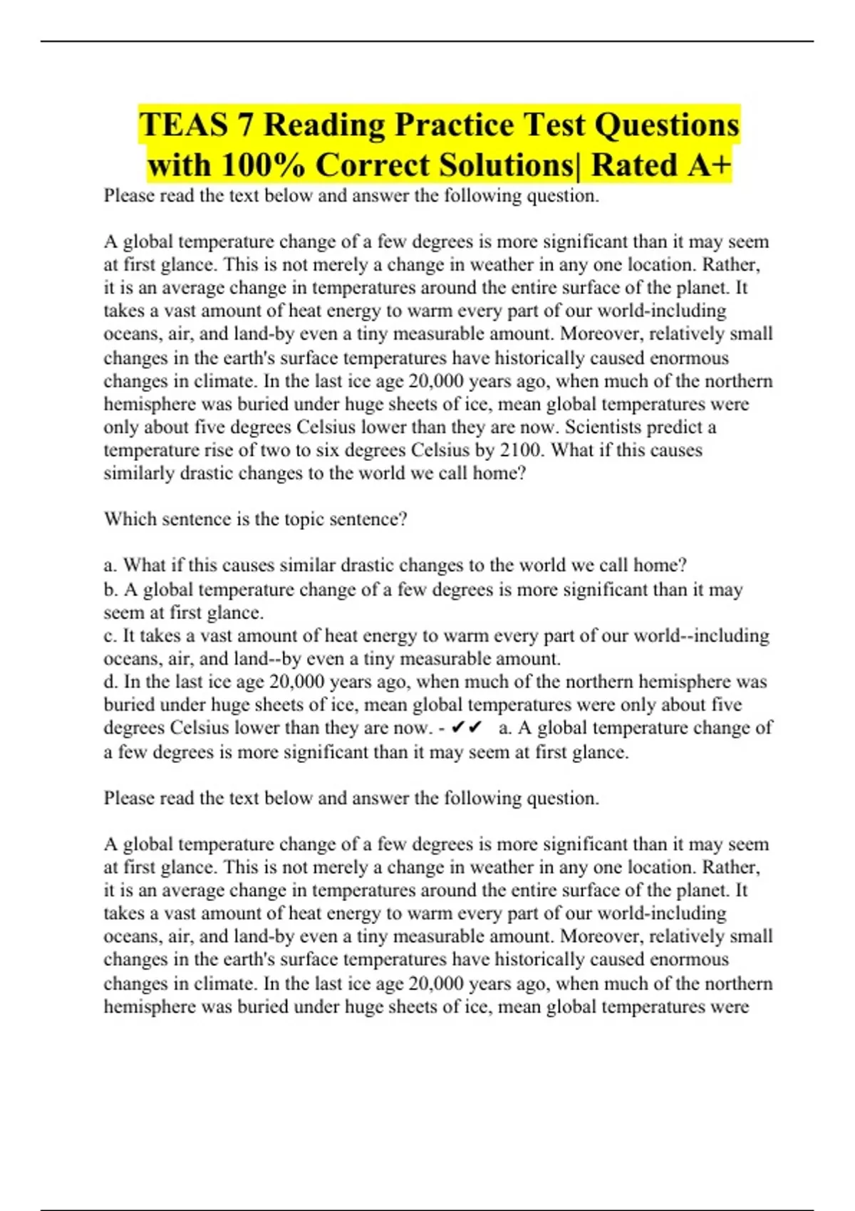 TEAS 7 Reading Practice Test Questions with 100% Correct Solutions| Rated A+