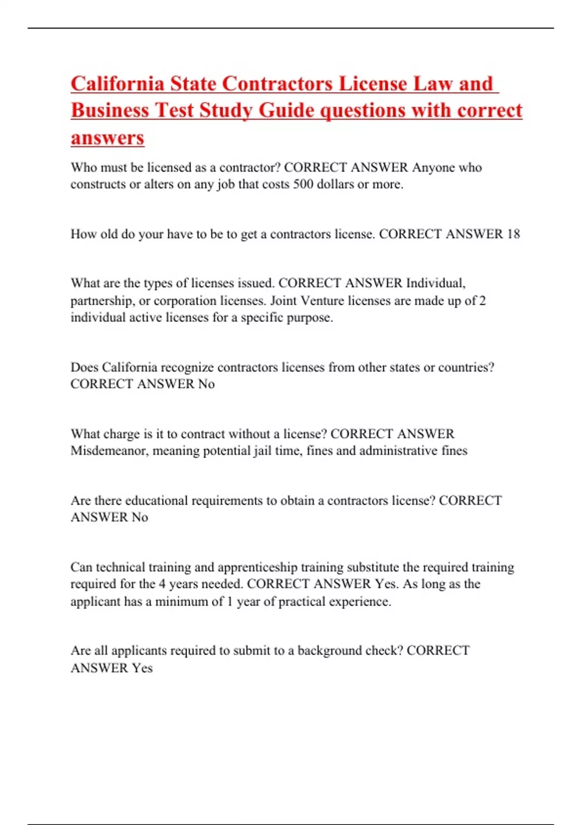 Who must be licensed as a contractor? CORRECT ANSWER Anyone who constructs or alters on any job that costs 500 dollars or more. How old do your have to be to get a contractors license. CORRECT ANSWER 18 What are the types of licenses issued. CORRECT ANSWER Individual, partnership, or corporation licenses. Joint Venture licenses are made up of 2 individual active licenses for a specific purpose. Does California recognize contractors licenses from other states or countries? CORRECT ANSWER No What charge is it to contract without a license? CORRECT ANSWER Misdemeanor, meaning potential jail time, fines and administrative fines Are there educational requirements to obtain a contractors license? CORRECT ANSWER No Can technical training and apprenticeship training substitute the required training required for the 4 years needed. CORRECT ANSWER Yes. As long as the applicant has a minimum of 1 year of practical experience. Are all applicants required to submit to a background check? CORRECT ANSWER Yes What are the total fees I must pay to obt