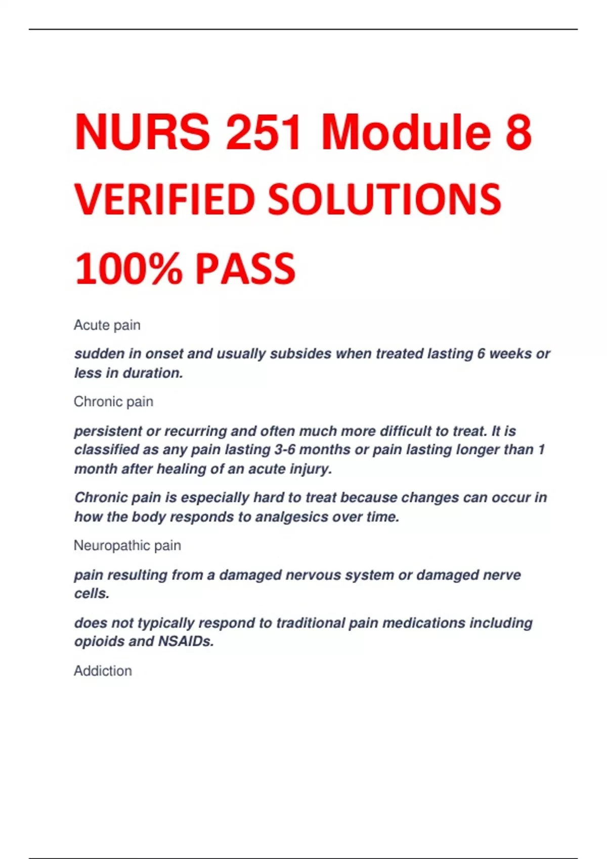 NURS 251 Module 8 VERIFIED SOLUTIONS 100% PASS Acute pain sudden in onset and usually subsides when treated lasting 6 weeks or less in duration. Chronic pain persistent or recurring and often much more difficult to treat. It is classified as any pain lasting 3-6 months or pain lasting longer than 1 month after healing of an acute injury. Chronic pain is especially hard to treat because changes can occur in how the body responds to analgesics over time. Neuropathic pain pain resulting from a damaged nervous system or damaged nerve cells. does not typically respond to traditional pain medications including opioids and NSAIDs. Addiction chronic neurobiological disease in which genetic, psychosocial, and environmental factors induce changes in the individual’s behavior to compulsively use drugs despite the harm they may cause. Analgesics medications that relieve pain without causing loss of consciousness. Opioid analgesics synthetic drugs that bind to the opiate receptors in the brain and relieve pain NSAIDs large chemically diverse group of drugs that are analgesics and also possess anti-inflammatory and antipyretic activity Tolerance state in which repetitive exposure to a given drug over time induces changes in the drug receptors that reduce the drug’s effects. Physical dependence condition in which a patient takes a drug over a period of time and unpleasant physical symptoms (withdrawal) occur if the drug is stopped abruptly or smaller doses are given and is another sign that tolerance has developed. NSAIDs MOA NSAIDs work by inhibiting the leukotriene or prostaglandin pathway or both. They specifically wo