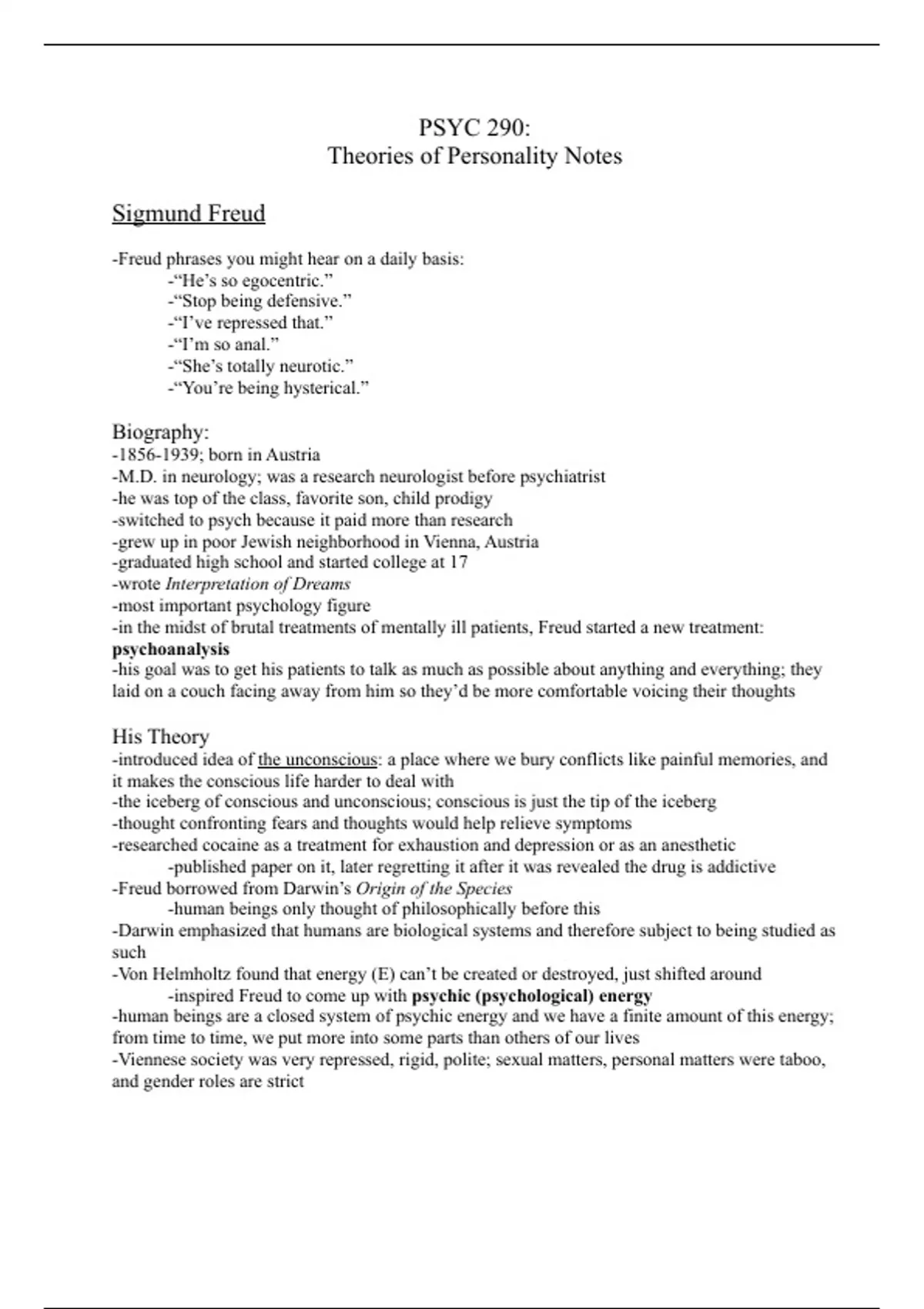 Theories of Personality (PSYC 290) Sigmund & Anna Freud Notes
