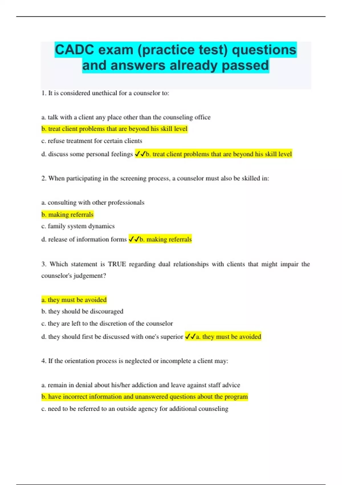 1. It is considered unethical for a counselor to: a. talk with a client any place other than the counseling office b. treat client problems that are beyond his skill level c. refuse treatment for certain clients d. discuss some personal feelings b. treat client problems that are beyond his skill level 2. When participating in the screening process, a counselor must also be skilled in: a. consulting with other professionals b. making referrals c. family system dynamics d. release of information forms b. making referrals 3. Which statement is TRUE regarding dual relationships with clients that might impair the counselor's judgement? a. they must be avoided b. they should be discouraged c. they are left to the discretion of the counselor d. they should first be discussed with one's superior a. they must be avoided