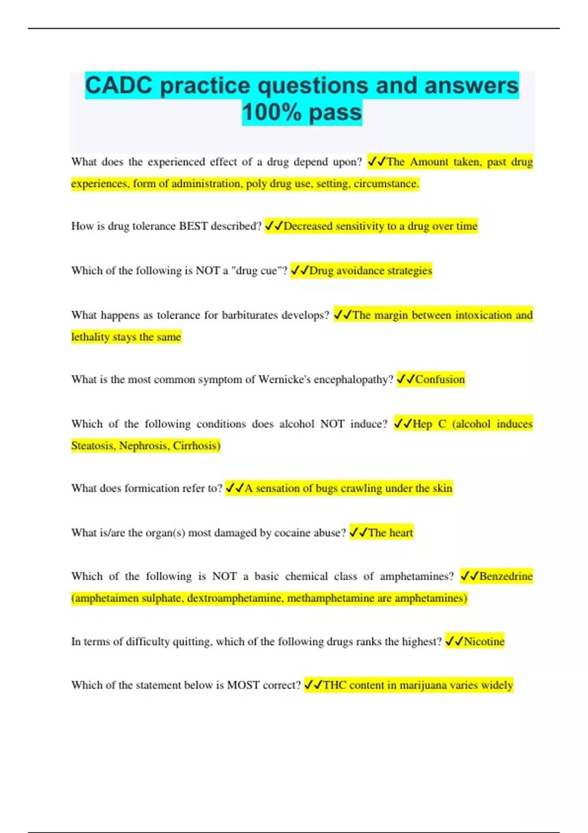 What does the experienced effect of a drug depend upon? The Amount taken, past drug experiences, form of administration, poly drug use, setting, circumstance. How is drug tolerance BEST described? Decreased sensitivity to a drug over time Which of the following is NOT a "drug cue"? Drug avoidance strategies What happens as tolerance for barbiturates develops? The margin between intoxication and lethality stays the same What is the most common symptom of Wernicke's encephalopathy? Confusion Which of the following conditions does alcohol NOT induce? Hep C (alcohol induces Steatosis, Nephrosis, Cirrhosis)