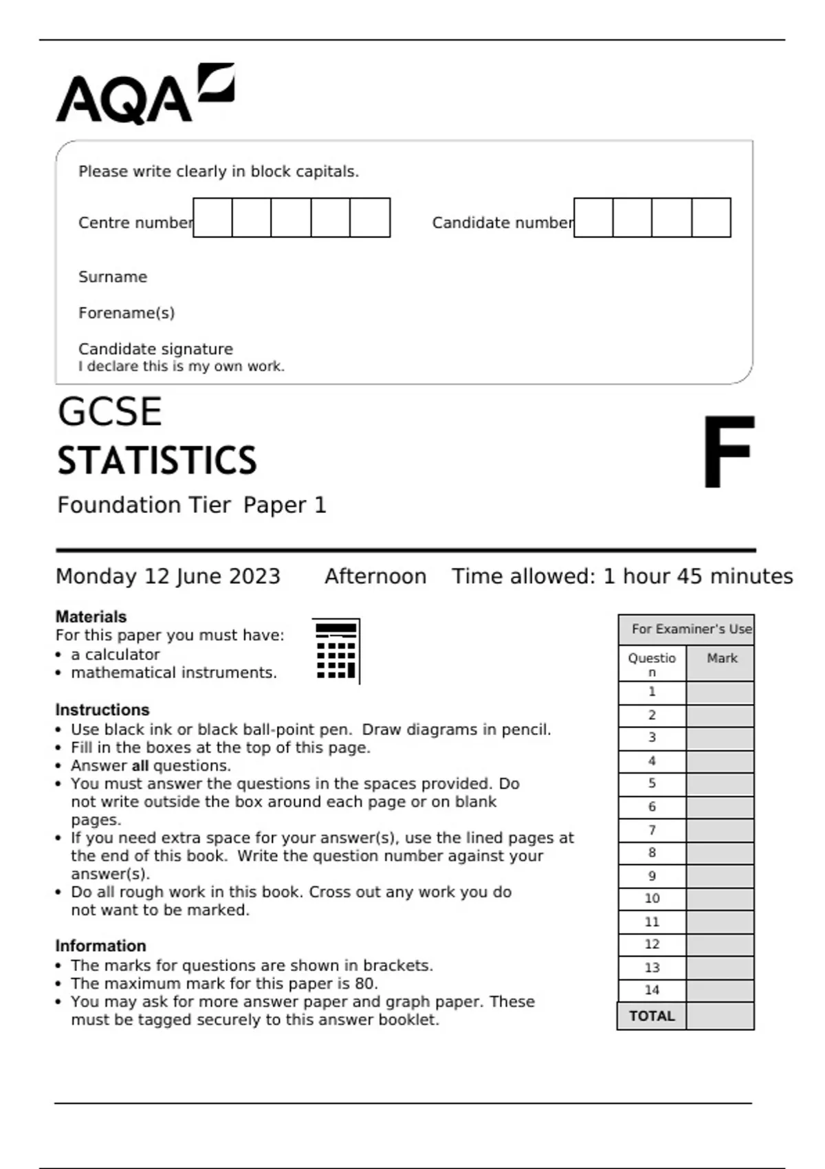 STATISTICS Foundation Tier Paper 1 Monday 12 June 2023 Afternoon Time allowed: 1 hour 45 minutes Materials For this paper you must have: • a calculator • mathematical instruments. Instructions • Use black ink or black ball-point pen. Draw diagrams in pencil. • Fill in the boxes at the top of this page. • Answer all questions. • You must answer the questions in the spaces provided. Do not write outside the box around each page or on blank pages. • If you need extra space for your answer(s), use the lined pages at the end of this book. Write the question number against your answer(s). • Do all rough work in this book. Cross out any work you do not want to be marked. Information • The marks for questions are shown in brackets. • The maximum mark for this paper is 80. • You may ask for more answer paper and graph paper. These must be tagged securely to this answer booklet. *JUN23 3 21F01* IB/G/Jun23/E11 8382/1F Answer all questions in the spaces provided. Do not write outside the box 1 Here is a fair spinner. It is spun once. What is the probability that it lands on a 1? Circle your answer. [1 mark] 2 Here are some data. warm warm hot cold cold warm hot hot warm cold hot warm 2 (a) Circle the word that best describes this type of data. [1 mark] quantitative continuous discrete qualitative 2 (b) Which of these diagrams would not be suitable to represent these data? Circle your answer. [1 mark] 3 A, B, C and D are scatter diagrams. Which diagram shows positive correlation? Circle your answer. [1 mark] Do not write outside the box Turn over for the next question Turn over ► 4 (b) The table shows her results. Do not write outside the box Number of hairstyling products used each day 0 1 2 3 4 Frequency 7 12 6 5 2 4 (b) (i) Write down the mode for the number of hairstyling products used each day. [1 mark] Answer 4 (b) (ii) What fraction of the class used more than 1 hairstyling product each day? [2 marks] Answer Turn over for the next question Do not write outside the box Turn over ► 5 Pria owns a café. She wants to begin offering soup at lunchtime. Pria collects information about her customers’ favourite soup. The table shows her results. Do not write outside the box Favourite soup Number of customers Vegetable 12 Chicken 18 Tomato 20 Mushroom 8 Other 3 5 (a) Write down two conclusions from Pria’s results. [2 marks] Conclusion 1 Conclusion 2 5 (c) Pria wants to know how often her customers eat soup for lunch. She produces this questionnaire. Do not write outside the box 5 (c) (i) Write down one problem with the question. [1 mark] 5 (c) (ii) Write down two problems with the response section. [2 marks] 1 2 *07* Question 5 continues on the next page Turn over ► Pria designs a more suitable questionnaire. She gives it to the first 25 customers who enter her café for lunch one day. 5 (d) (i) Name this sampling method. [1 mark] Answer 5 (d) (ii) Give one advantage of this sampling method. [1 mark] 5 (d) (iii) Give one disadvantage of this sampling method. [1 mark] *0* Do not write outside the box 6 (a) His hypothesis is, “Will more people subscribe to my channel?” Question 6 continues on the next page Do not write outside the box Turn over ► These data show the number of new subscribers to Nik’s channel for the first 14 days after the prize draw was set up. Do not write outside the box 170 400 1300 600 2400 1300 1300 3800 2400 4100 4100 3500 18 800 4300 6 (b) Nik’s friend says, “On average, the daily number of new subscribers during the 14 days is more than 3000” Nik comments, “It depends on which average you use.” Is Nik correct? You must show your working. [4 marks] Question 6 continues on the next page Do not write outside the box Turn over ► Do not write outside the box Turn over for the next question Do not write outside the box Turn over ► There are no questions printed on this page DO NOT WRITE ON THIS PAGE ANSWER IN THE SPACES PROVIDED Do not write outside the box 7 A travel company produced this graph to use in an advert. Average cost of a cruise 7 (a) (i) Give a reason why this graph is misleading. [1 mark] 7 (a) (ii) On the grid below, draw a graph that, • shows the same information • is not misleading. [2 marks] Average cost of a cruise Turn over ► Do not write outside the box 7 (b) The table shows the number of each type of holiday the travel company sold last week. Do not write outside the box Holiday type Ski Cruise Beach Adventure Frequency 5 34 34 17 7 (b) (i) Draw a fully labelled pie chart to illustrate the data in the table. [4 marks]