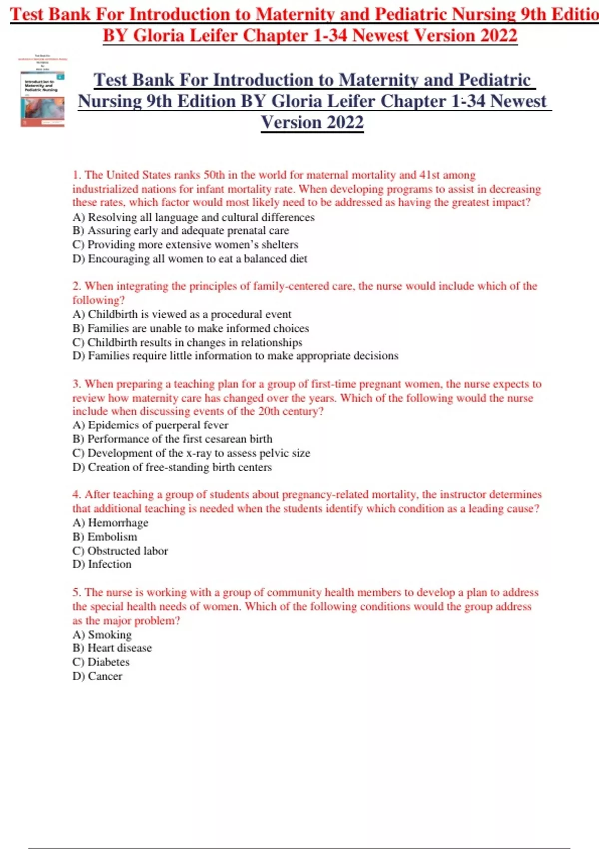 Test Bank For Introduction to Maternity and Pediatric Nursing 9th Edition BY Gloria Leifer Chapter 1-34 Newest Version 2022