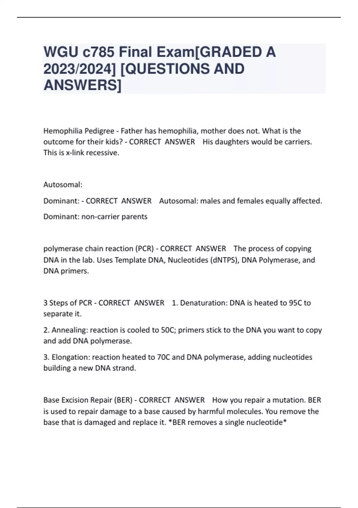 WGU c785 Final Exam[GRADED A 2023/2024] [QUESTIONS AND ANSWERS] Hemophilia Pedigree - Father has hemophilia, mother does not. What is the outcome for their kids? - CORRECT ANSWER His daughters would be carriers. This is x-link recessive. Autosomal: Dominant: - CORRECT ANSWER Autosomal: males and females equally affected. Dominant: non-carrier parents polymerase chain reaction (PCR) - CORRECT ANSWER The process of copying DNA in the lab. Uses Template DNA, Nucleotides (dNTPS), DNA Polymerase, and DNA primers. 3 Steps of PCR - CORRECT ANSWER 1. Denaturation: DNA is heated to 95C to separate it. 2. Annealing: reaction is cooled to 50C; primers stick to the DNA you want to copy and add DNA polymerase. 3. Elongation: reaction heated to 70C and DNA polymerase, adding nucleotides building a new DNA strand. Base Excision Repair (BER) - CORRECT ANSWER How you repair a mutation. BER is used to repair damage to a base caused by harmful molecules. You remove the base that is damaged and replace it. *BER removes a single nucleotide* DNA glycolsylase - sees damaged DNA and removes it. DNA polymerase-puts the right one back in while DNA ligase seals it. Mismatch repair (MMR) occurs during: - CORRECT ANSWER replication. DNA polymerase proofreads but sometimes a mismatch pair gets through. MMR removes a large section of the nucleotides from the new DNA and DNA polymerase tries again. (Ex: C-T instead of C-A) Mismatch Repair corrects what kind of DNA damage? - CORRECT ANSWER When a base is mismatched due to errors in replication. Such as G-T instead of GC. DNA polymerase comes by and fixes it. What happens when DNA polymerase binds to DNA to make RNA? - CORRECT ANSWER TRANSCRIPTION! DNA polymerase takes the individual nucleotides and match