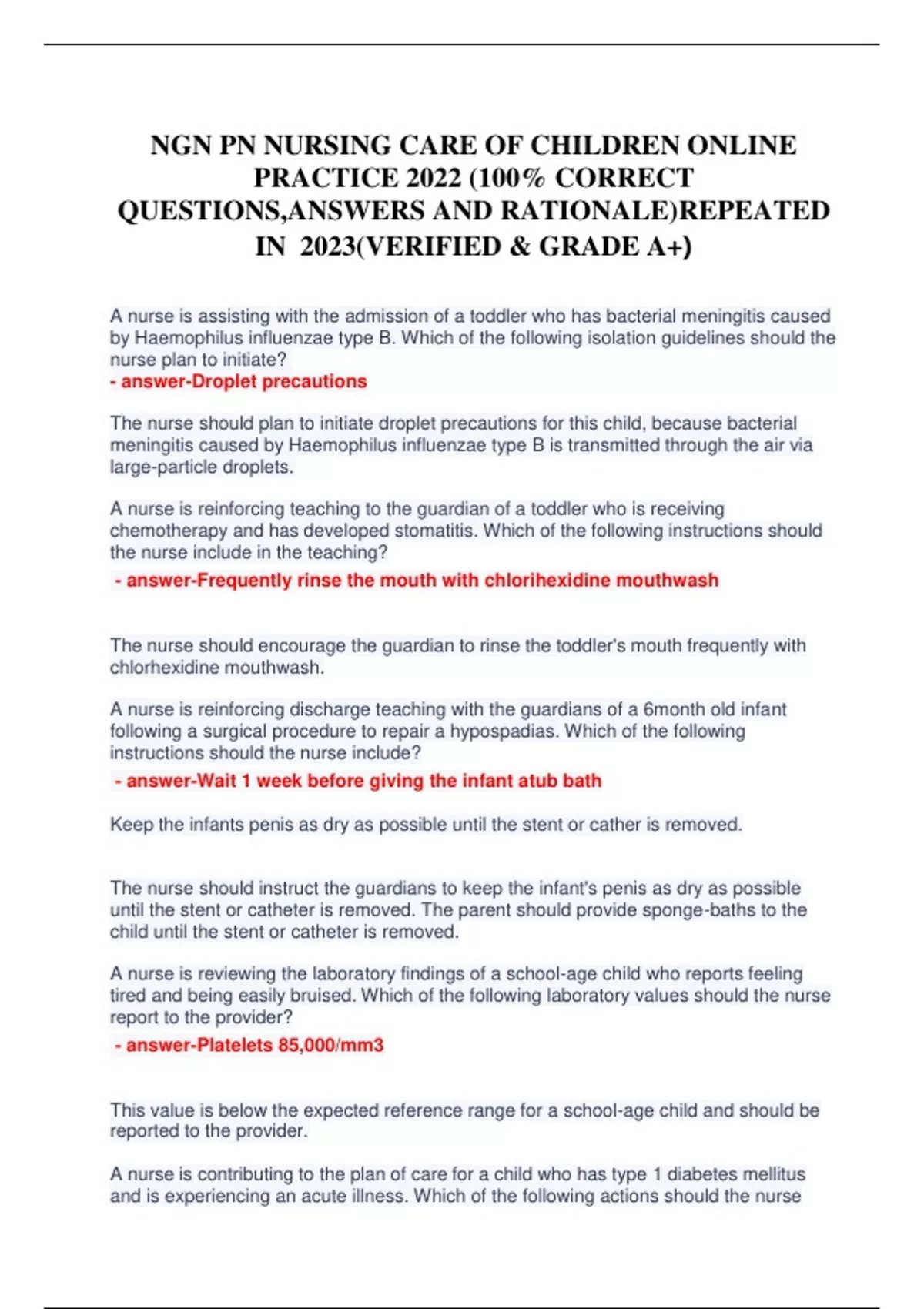 NGN PN NURSING CARE OF CHILDREN ONLINE PRACTICE 2022 (100% CORRECT QUESTIONS,ANSWERS AND RATIONALE)REPEATED IN 2023(VERIFIED & GRADE A+)