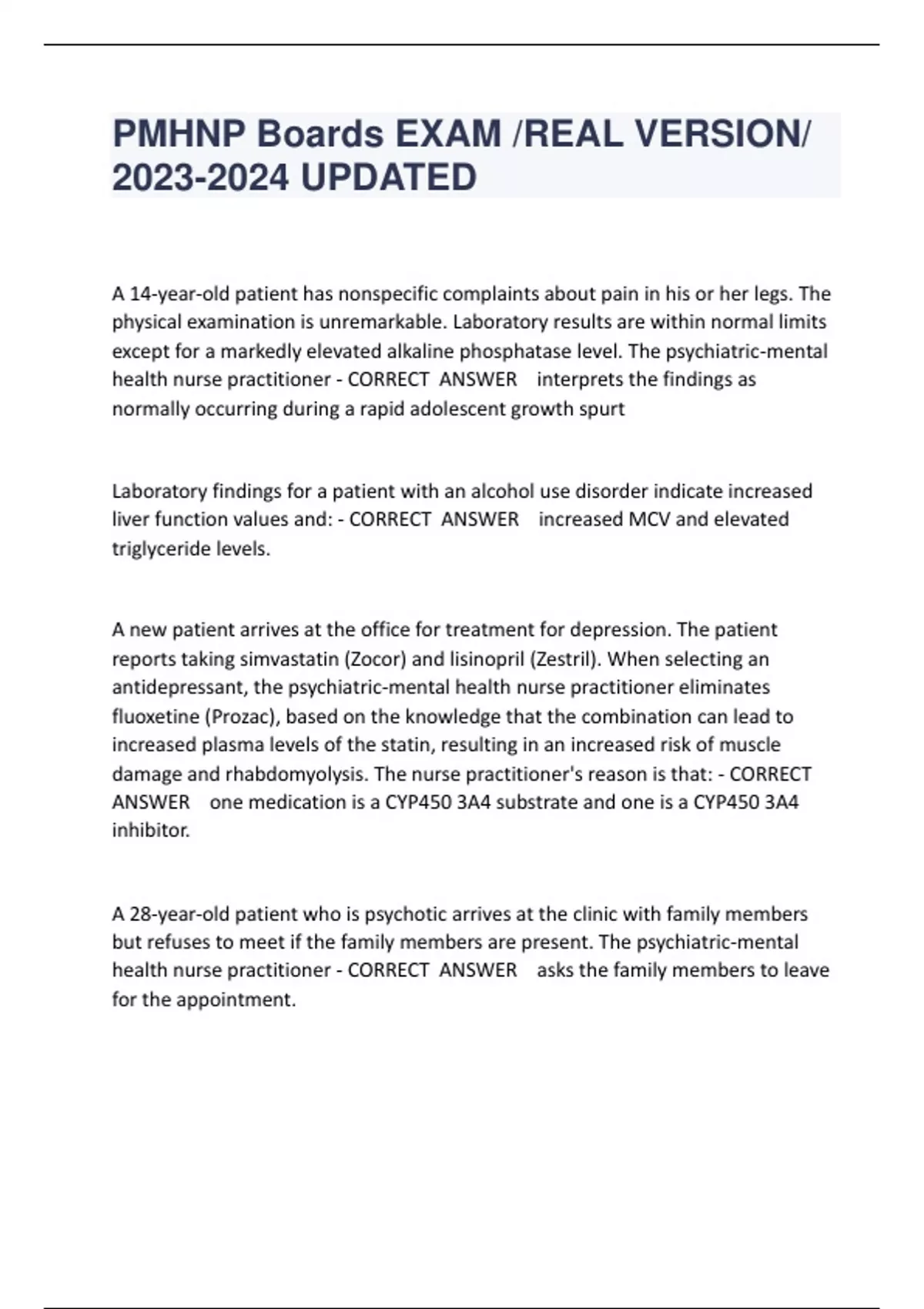 PMHNP Boards EXAM /REAL VERSION/ UPDATED A 14-year-old patient has nonspecific complaints about pain in his or her legs. The physical examination is unremarkable. Laboratory results are within normal limits except for a markedly elevated alkaline phosphatase level. The psychiatric-mental health nurse practitioner - CORRECT ANSWER interprets the findings as normally occurring during a rapid adolescent growth spurt Laboratory findings for a patient with an alcohol use disorder indicate increased liver function values and: - CORRECT ANSWER increased MCV and elevated triglyceride levels. A new patient arrives at the office for treatment for depression. The patient reports taking simvastatin (Zocor) and lisinopril (Zestril). When selecting an antidepressant, the psychiatric-mental health nurse practitioner eliminates fluoxetine (Prozac), based on the knowledge that the combination can lead to increased plasma levels of the statin, resulting in an increased risk of muscle damage and rhabdomyolysis. The nurse practitioner's reason is that: - CORRECT ANSWER one medication is a CYP450 3A4 substrate and one is a CYP450 3A4 inhibitor. A 28-year-old patient who is psychotic arrives at the clinic with family members but refuses to meet if the family members are present. The psychiatric-mental health nurse practitioner - CORRECT ANSWER asks the family members to leave for the appointment. The psychiatric-mental health nurse practitioner is responsible for initiating quality improvement at a community mental health clinic. The effective strategy for evaluating the clinic's services is to: - CORRECT ANSWER use a survey to elicit patient satisfaction responses. The psychiatric-mental health nurse practitioner evaluates a new adult patient via telemedicine. The patient has questions about a new medication that he or she recently started. The nurse practitioner decides to provide psychoeducation and to: - CORRECT ANSWER e-mail drug information and resources Any court of law that evaluates the standards of care provided by a psychiatricmental health nurse practitioner - CORRECT ANSWER considers what a reasonably prudent health care provider would do. The psychiatric-mental health nurse practitioner and a team of local mental health professionals are asked to provide crisis counseling service, after a gunman recently took a class hostage at a local elementary school, wounded several students, and then shot himself. In preparing for this assignment, the nurse practitioner recognizes that: - CORRECT ANSWER a child's developmental stage will influence his or her response to catastrophic stress Which community-based program is a tertiary level intervention? - CORRECT ANSWER Partial hospitalization program that provides intensive group therapy for rehabilitatio