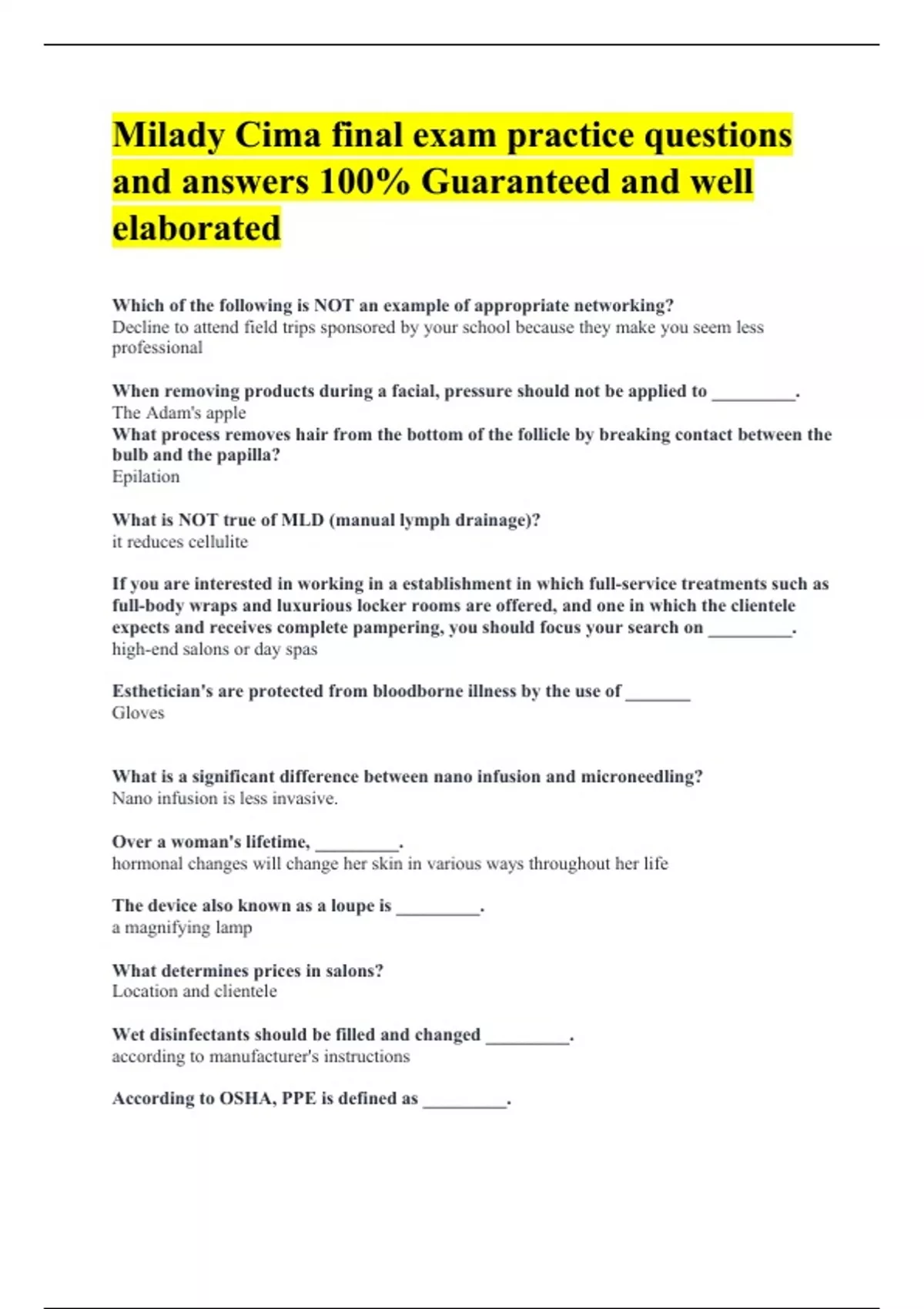 Milady Cima final exam practice questions and answers 100% Guaranteed and well elaborated